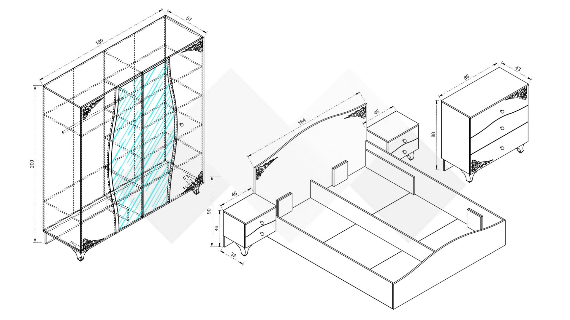 ✓ спалня ✓ механизъм за повдигане на матрака ✓ 2 бр нощни шкафчета ✓ четирикрилен гардероб ✓ огледални врати ✓ скрин ✓ модерен дизайн ✓ повдигащ механизъм ✓ качествена изработка ✓ 16 мм ПДЧ
