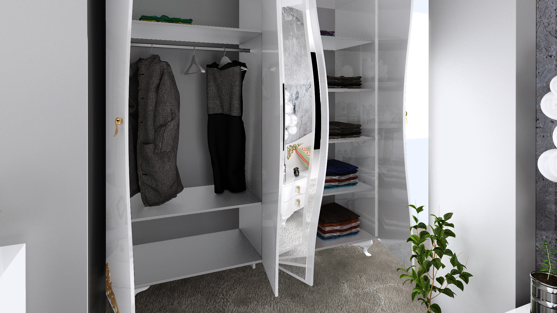 Гардеробът е четирикрилен, с огледални врати, които визуално разширяват пространството и създават повече светлина в помещението. Разполагаш с четири рафта, за да отганизираш сгънати дрехите си от едната и два от другата му страна, и лост за закачалки, за якета и палта. Декориран е със златни орнаменти в същия стил като леглото, което гарантира цялостна хармония в интериора. Осигурява достатъчно пространство за подредба на дрехи и аксесоари, комбинирайки функционалност и елегантност.