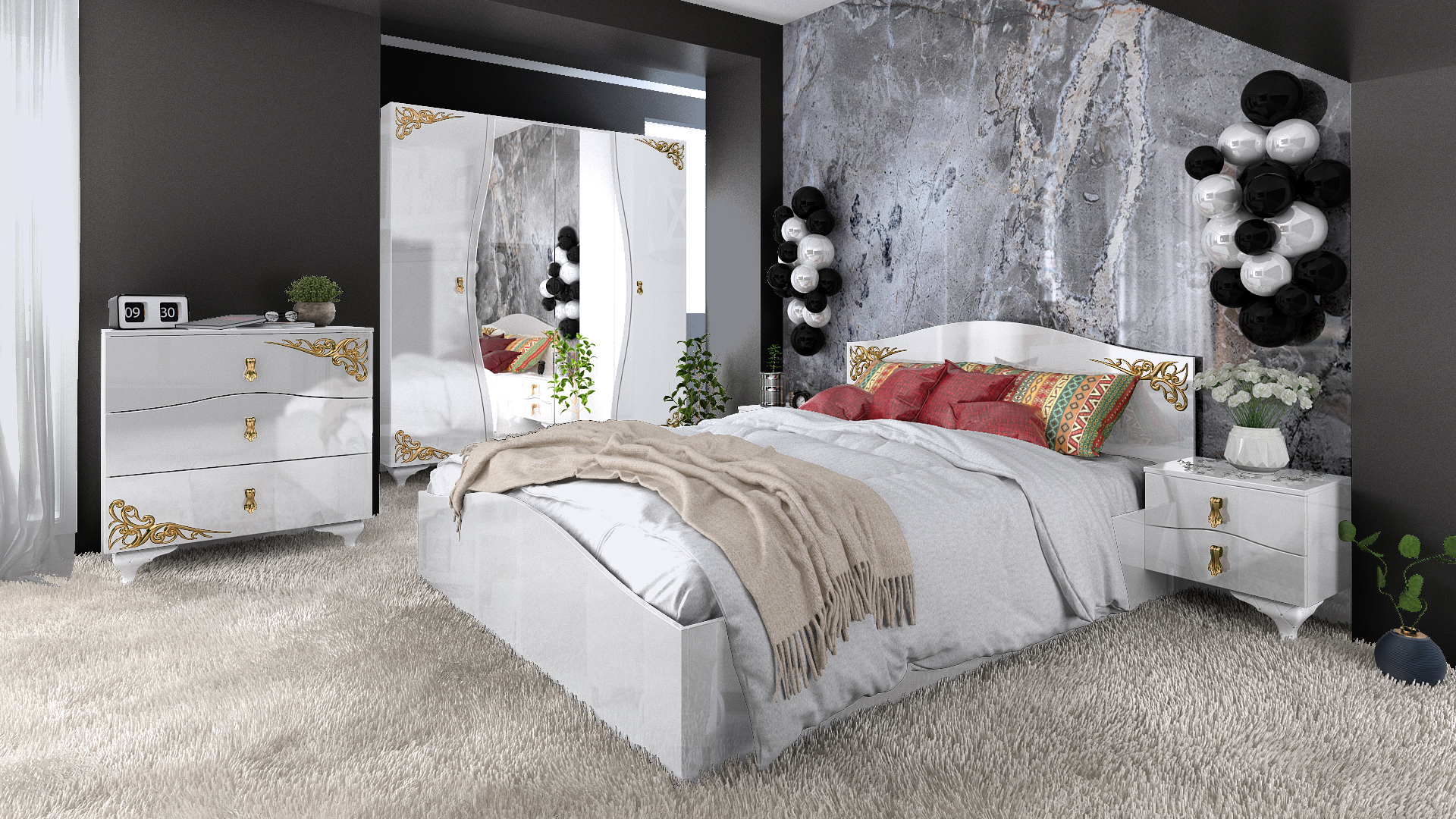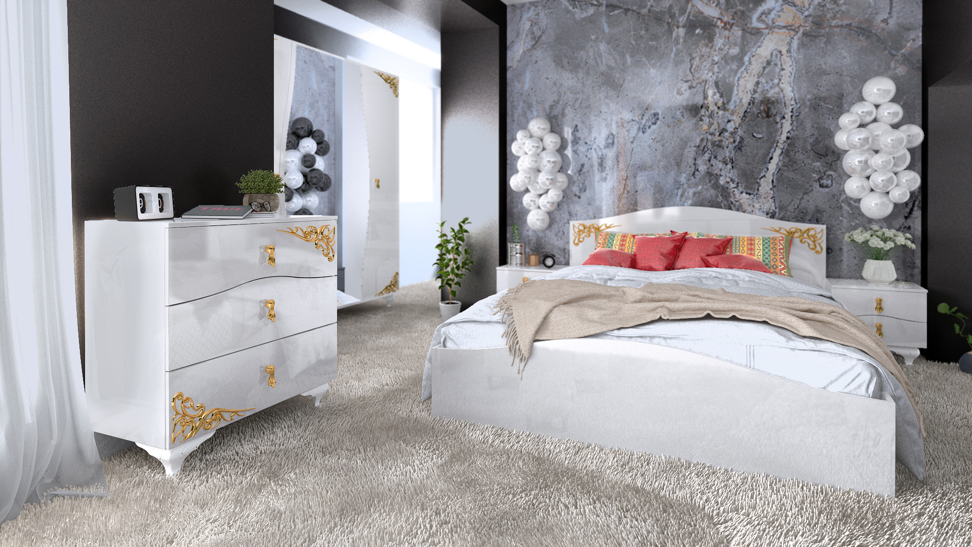 Спалнята е с изчистен и изискан дизайн в бял гланц, което придава модерно и свежо излъчване на спалнята. Подходяща е за матрак 160/200. Допълват я две нощни шкафчета с по две чекмеджета всяко, за да държиш важните неща под ръка. ПЛота е достатъчно голям, за да побере любими книги и нощна лампа. Декоративните златни орнаменти по таблата добавят усещане за лукс и стил. Удобната конструкция предлага комфорт и стабилност, а неутралният цвят лесно се съчетава с различни интериорни решения.
