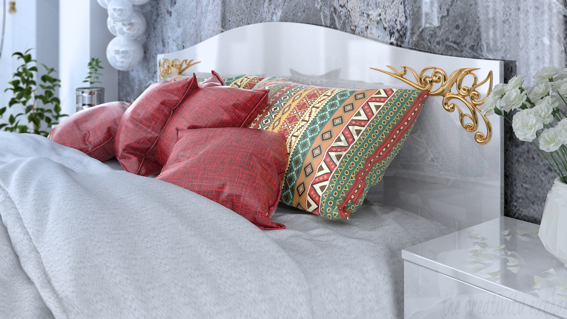 Скринът е компактен и практичен, с три чекмеджета за съхранение на лични вещи и текстил. Изработен е в бял гланц със златни декоративни акценти и стилни дръжки, което го прави едновременно красив и удобен за употреба. Той е завършващият акцент към комплекта, придавайки допълнителен уют и организация в спалнята.