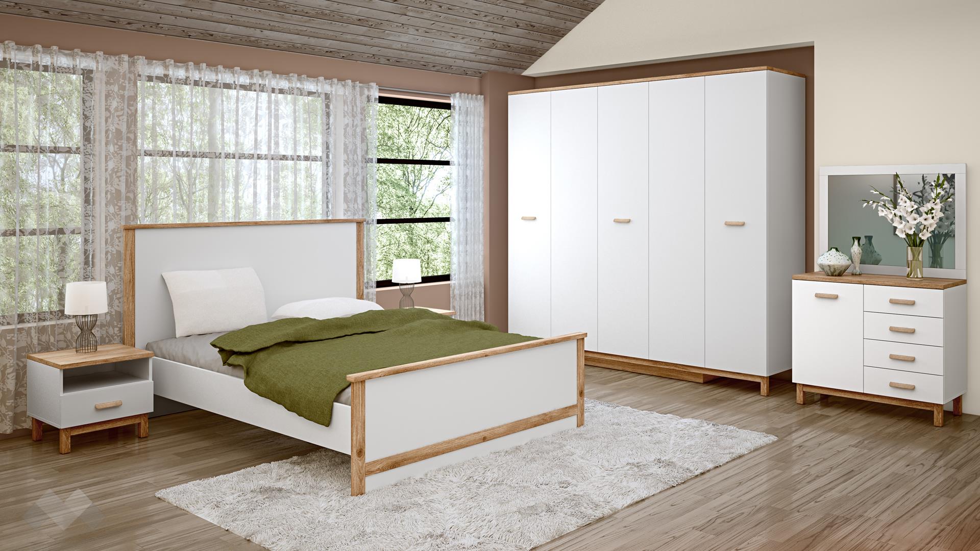 Централният елемент на комплекта е леглото с изцяло бяла основа, която придава лекота и модерно излъчване. Таблата на леглото също е бяла, но е елегантно рамкирана с декор дъб кадис, което добавя топъл, естествен акцент и подчертава линията на леглото. Тази комбинация създава усещане за чистота и естествена красота.