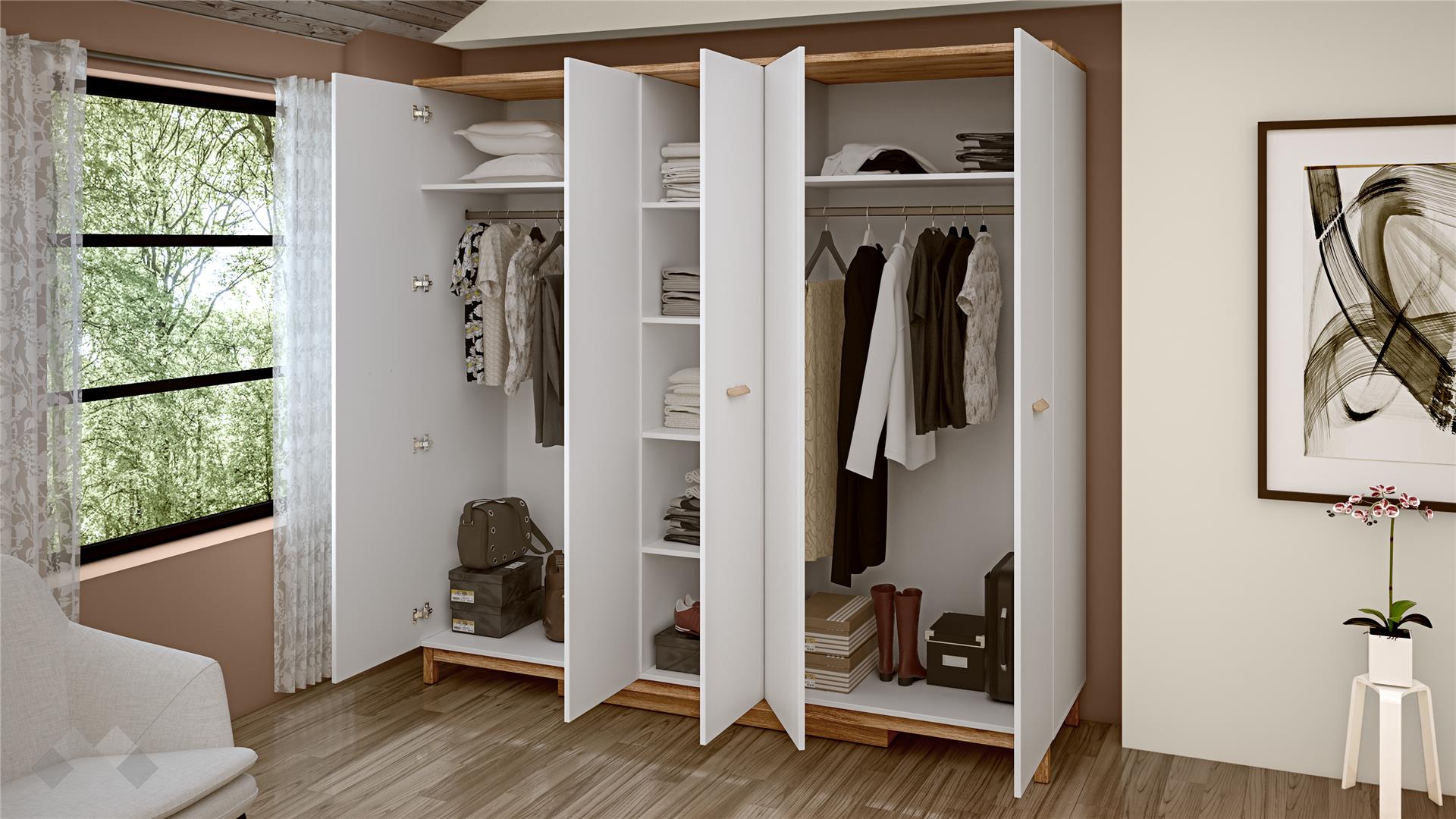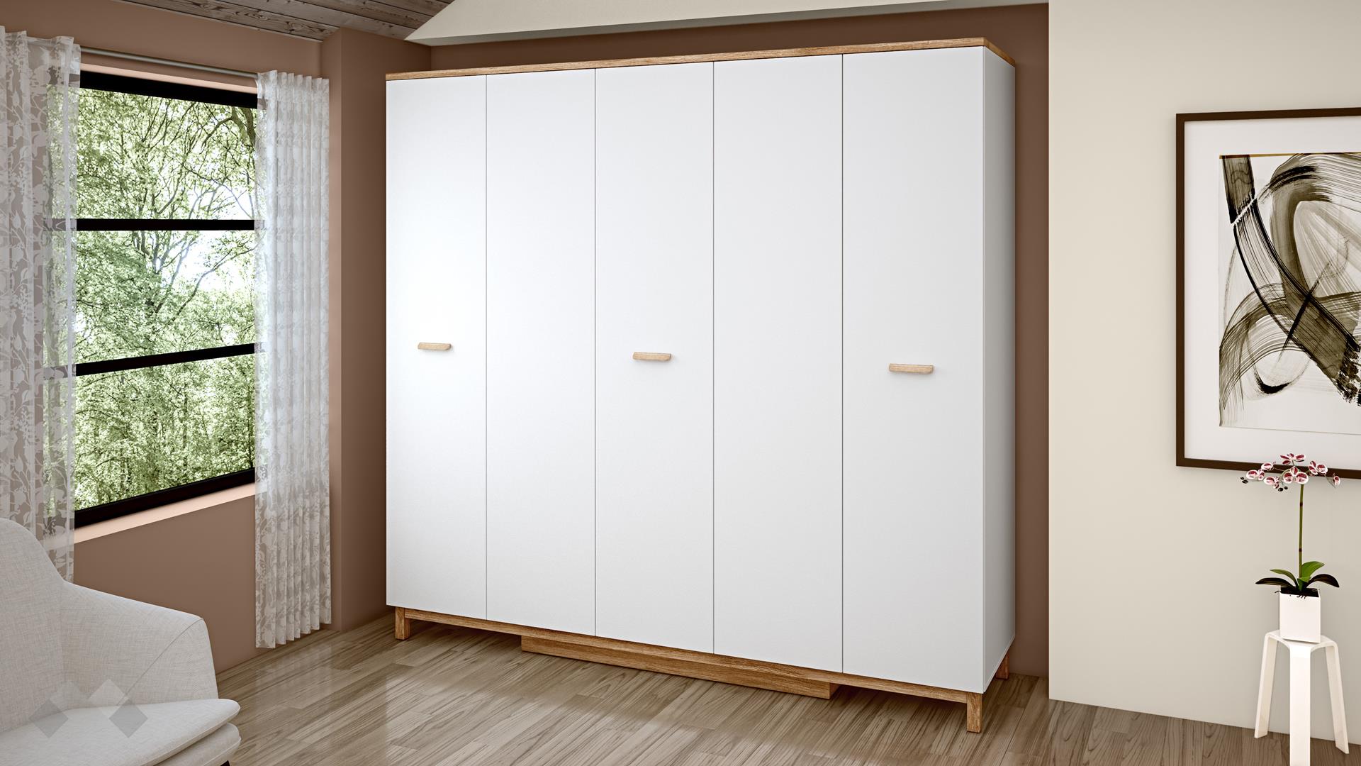 Големият петкрилен гардероб е практичното сърце на комплекта, предлагайки максимален капацитет за съхранение. Гардеробът разполага с пет крила, които осигуряват впечатляващо голям капацитет за съхранение. Това позволява изключително лесно и организирано прибиране на цялото облекло, аксесоари и спално бельо. Зад средната врата ще откриеш 4 рафта, а зад останалите врати се крият лостове за закачалки.