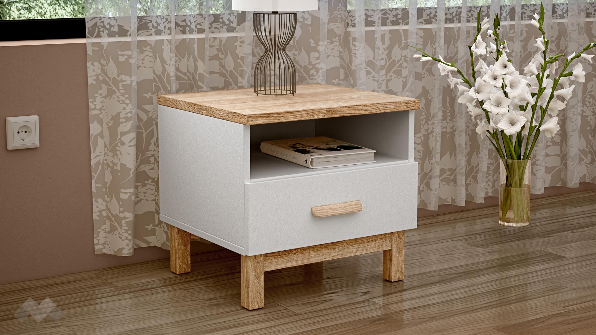 Нощният шкаф е проектиран с мисъл за максимална функционалност в компактни размери. Над чекмеджето има отворена ниша, която е идеална за поставяне на книги, списание, телефон или други предмети, които искате да са бързо и лесно достъпни.Под отворената ниша е разположено едно дълбоко чекмедже, осигуряващо дискретно място за съхранение на лични вещи, които не желаете да са на показ.