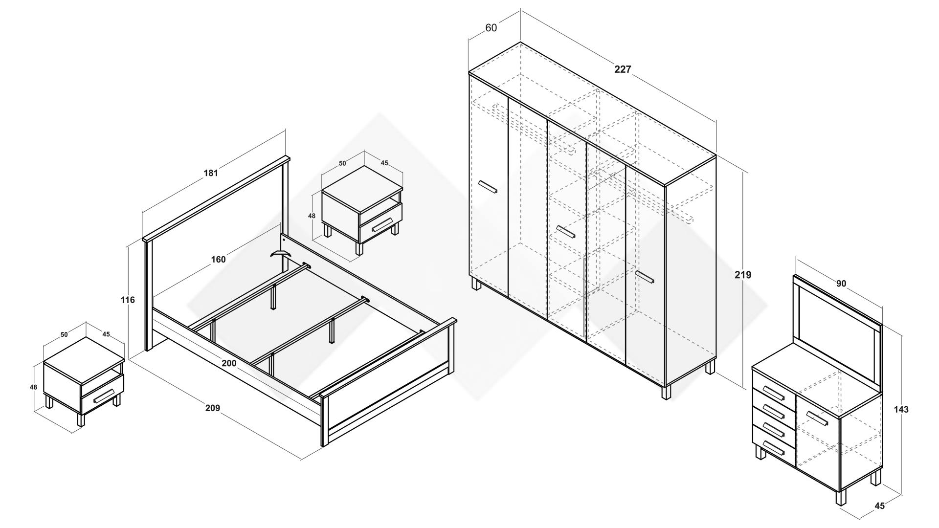 ⭐ Предимства:  ✓ 18 мм ПДЧ ✓ спалня с висока табла✓за матрак 160/200 ✓ 2 нощни шкафчета ✓ петкрилен гардероб ✓ скрин с огледало ✓ компактен и практичен ✓ модерен дизайн ✓ качествена изработка