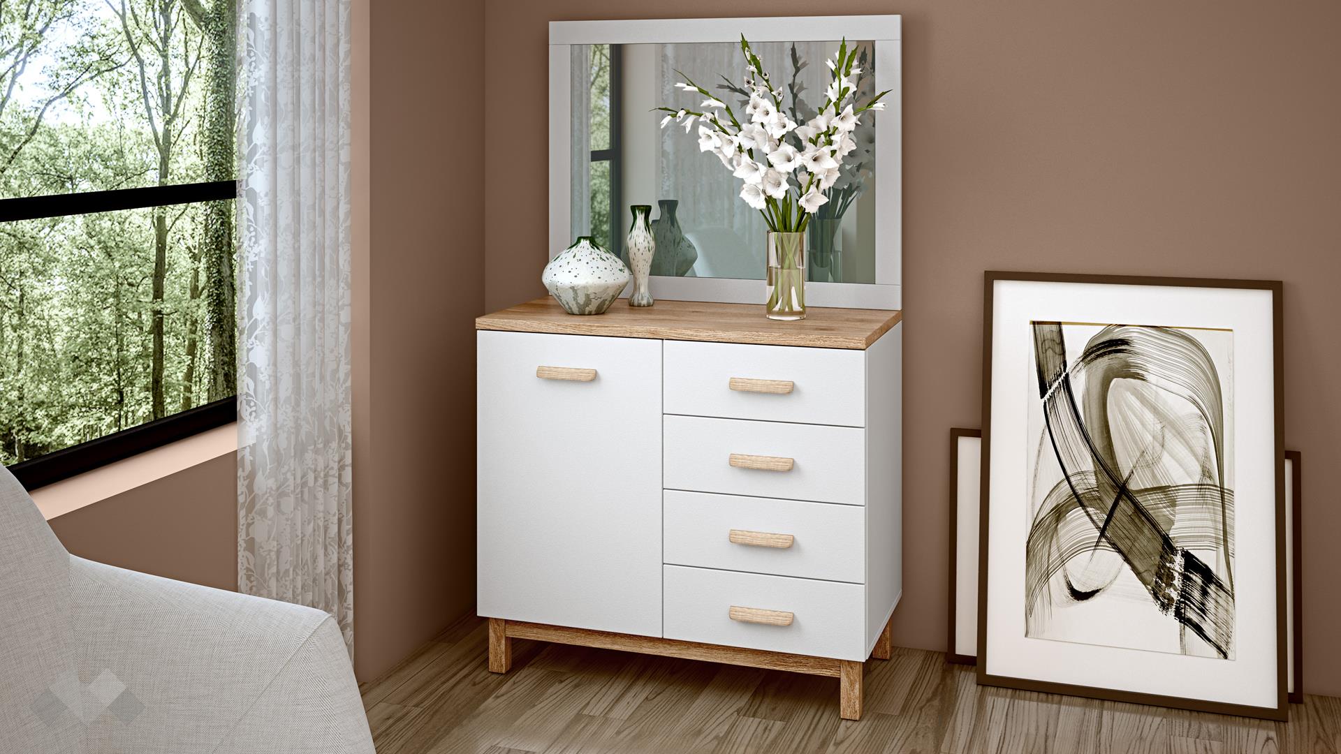 Комплектът включва функционален скрин, който предоставя обилно място за съхранение. Скринът разполага с четири чекмеджета, които осигуряват удобно организиране на дрехи и аксесоари. На скрина е поставено елегантно огледало, което едновременно е практично и допринася за оптическото разширяване на пространството.