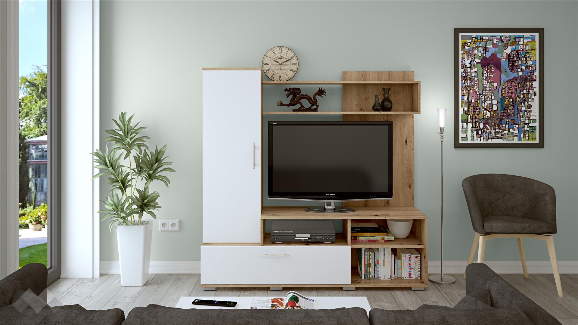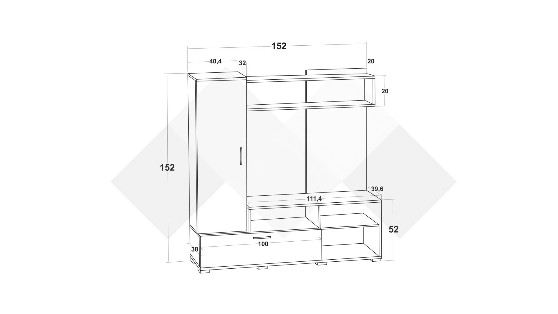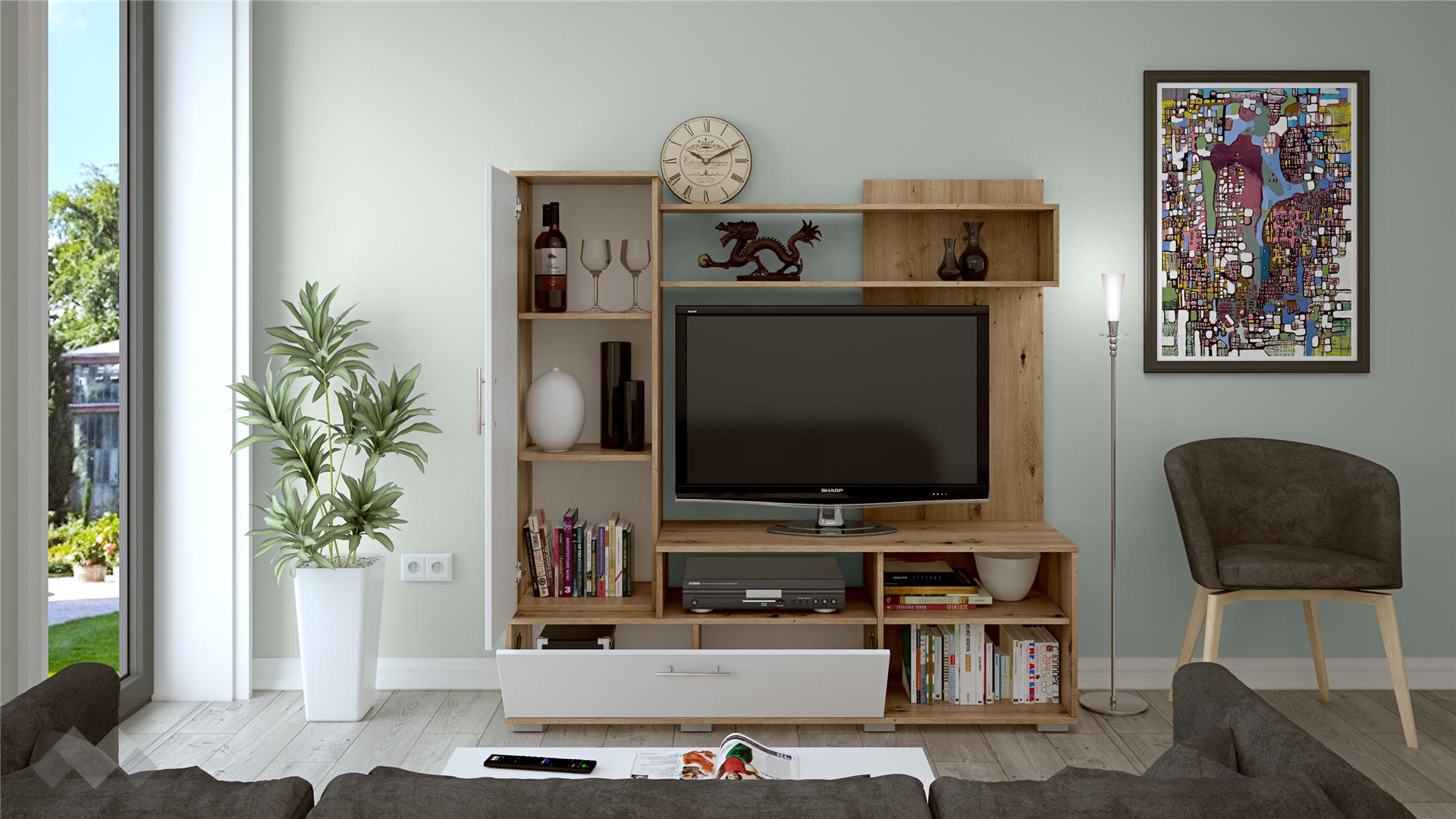 ⭐ Предимства: ✓ 2 шкафа ✓ 3 отворени рафта ✓ етажерка ✓ ТВ шкаф ✓ функционална и практична ✓ модерен дизайн ✓ качествена изработка ✓ 16 мм ПДЧ