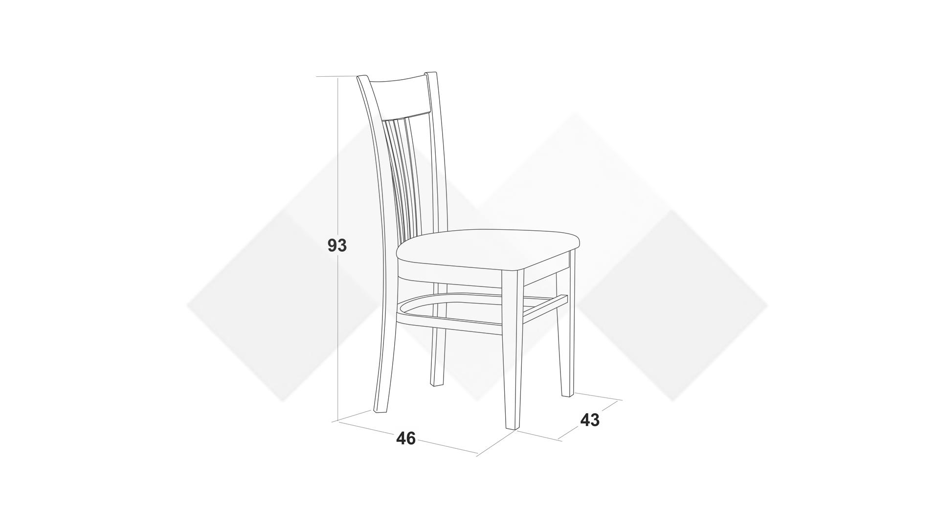 Столът е със здрава конструкция от естествена букова дървесина за устойчивост и стабилност, а лаковото покритие добавя елегантност. Седалката е проектирана с твърда основа, тапицирана с дунапрен за повече комфорт при седене и завършена със здрава текстилна дамаска, лесна за поддръжка.