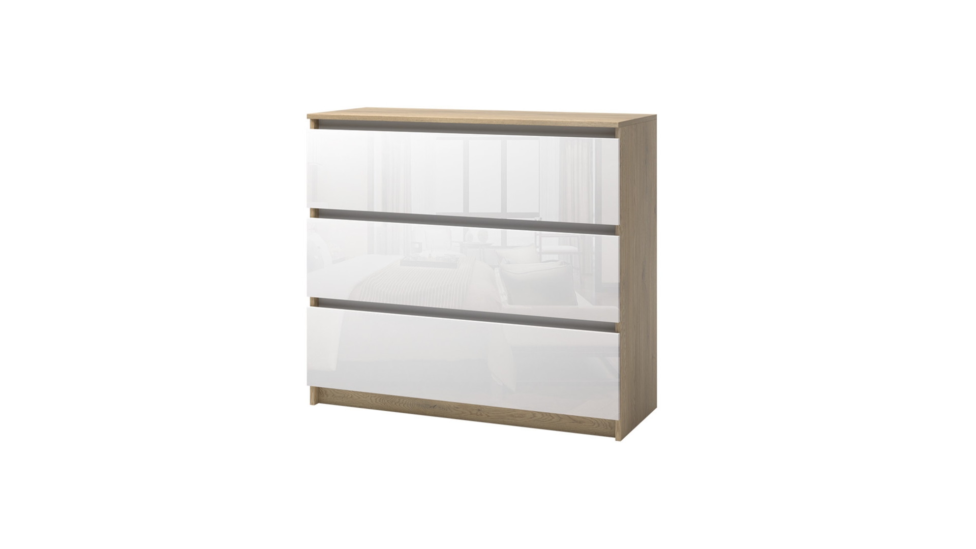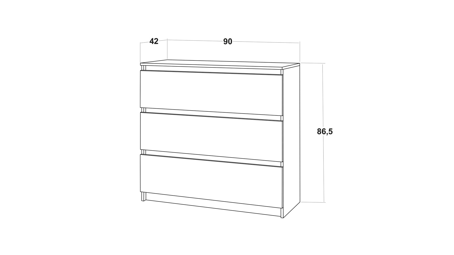 Моделът разполага с три чекмеджета, които предоставят удобно място за съхранение на дрехи, бельо, аксесоари или документи. Горният плот е подходящ за поставяне на декоративни елементи или осветление.