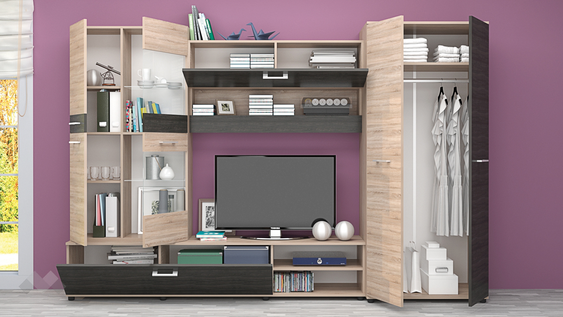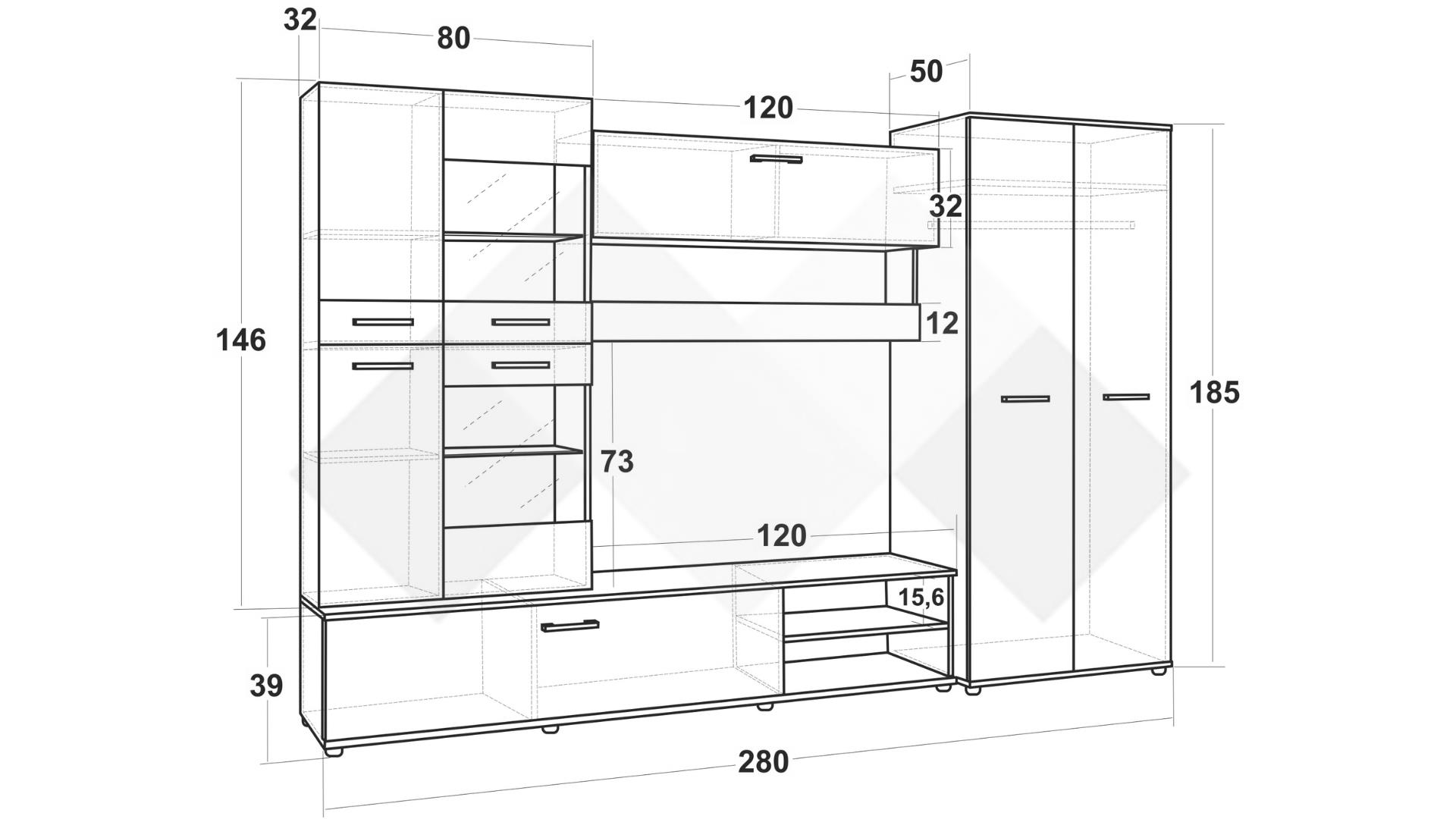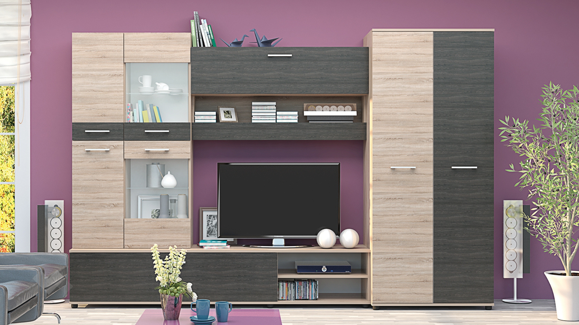 Основата на секцията представлява удобен ТВ шкаф, който се състои от шкаф с вратичка и две отворени ниши. Там ще откриеш достатъчно място за цялата си съпътстваща техника като ТВ приемници, DVD плейъри или други. Високият шкаф е съставен от две витрини с по един остъклен рафт и два затворени шкафа с по един рафт. Във витрините можеш да организираш всичките си красиви сервизи и съдове, а те ще засияят благодарение на LED осветлението, монтирано на остъклените рафтове. Над мястото за телевизор разполагаш с отворен рафт и шкаф с падаща врата. Рафтът е идеално място за подреждане на стилни декорации и скъпи спомени като фотографии или сувенири, а в затвореното пространство можеш да прибереш нещата, които предпочиташ да останат скрити от погледите. Двукрилният гардероб разполага с лост за закачалки и рафт, където можеш да организираш дрехите, за които все не ти достига място в гардероба в спалнята.