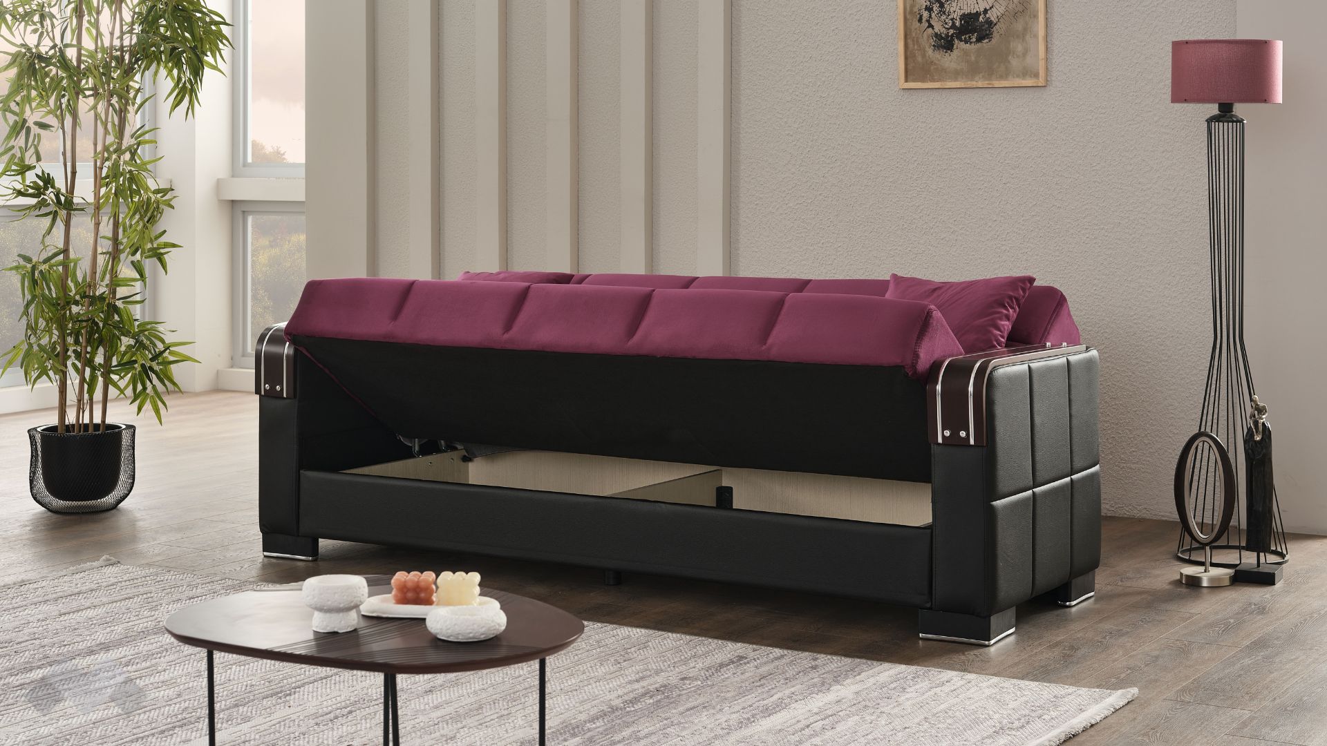 Диван Малатия е и функционален - благодарение на клик-клак механизма ще разполагаш с повече пространство за релакс - 112/190 см, а под седалката се крие удобна ракла, където да съхраняваш завивки, възглавници и други вещи. Дамаската е приятна на допир, изработена от здрав и устойчив текстил, а за още по изтънчена визия, подлакътниците са с покрити с матово-черна еко кожа.