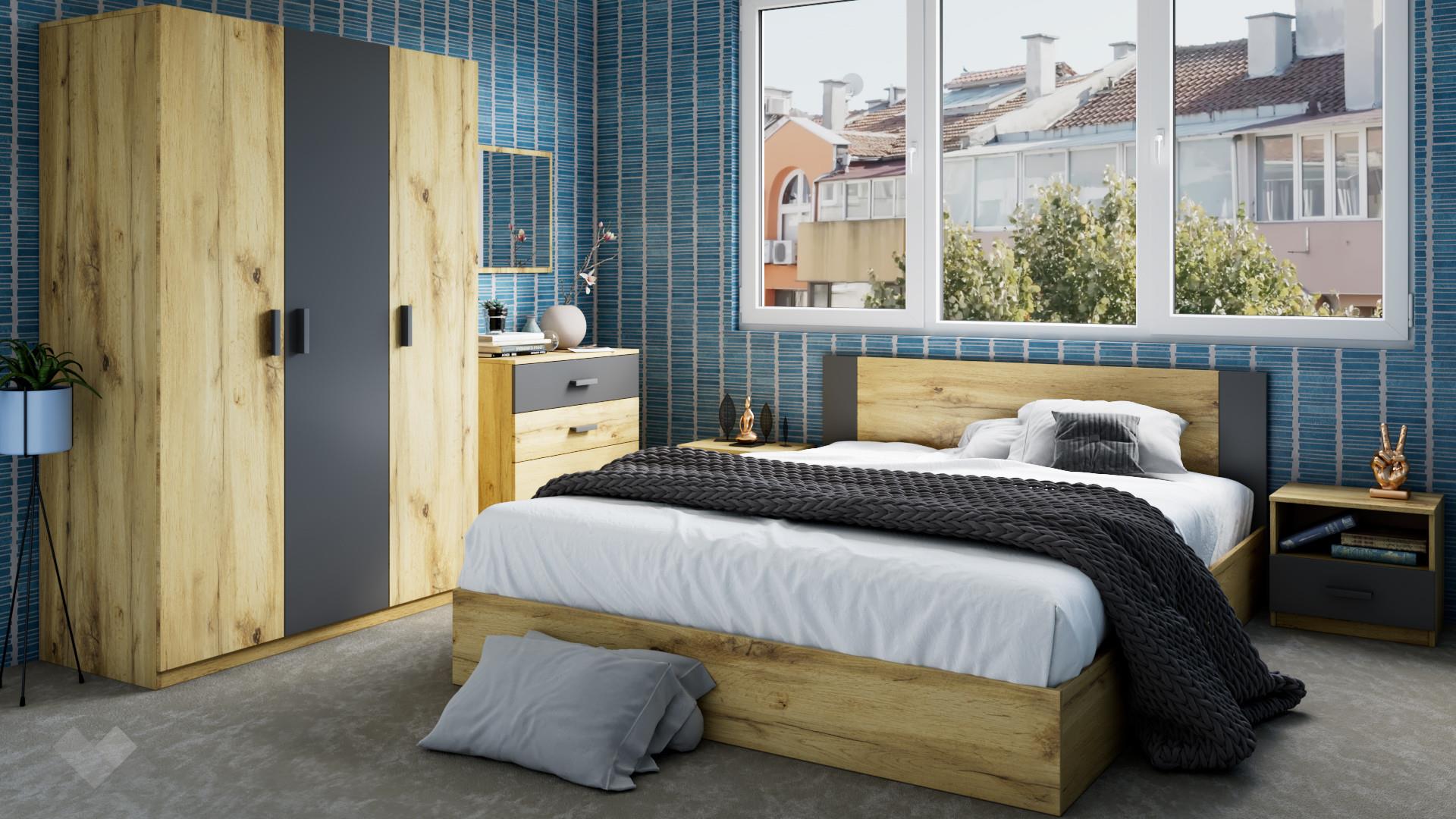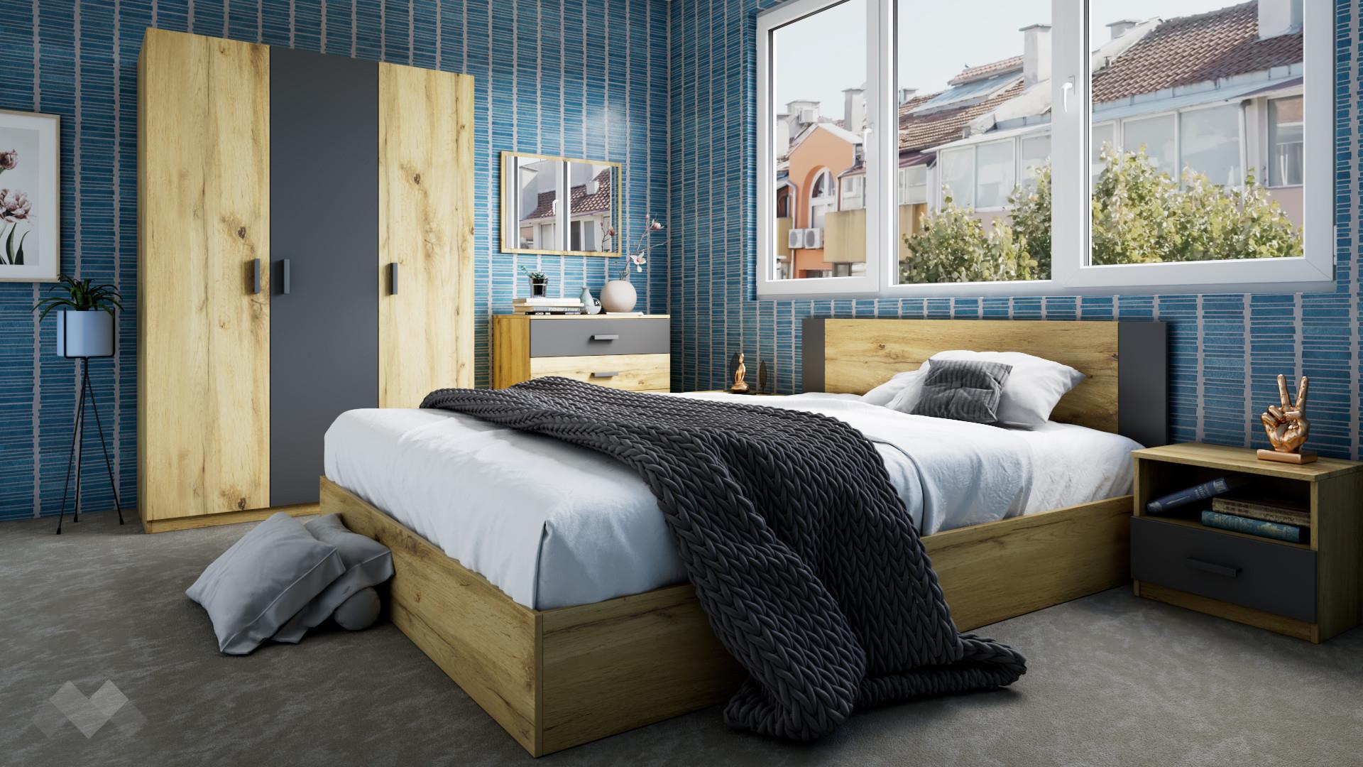 ✓ спалня за матрак 160/200 ✓ 2 бр. нощни шкафчета ✓ трикрилен гардероб ✓ скрин ✓ огледало ✓ качествена изработка ✓ 16 мм ПДЧ