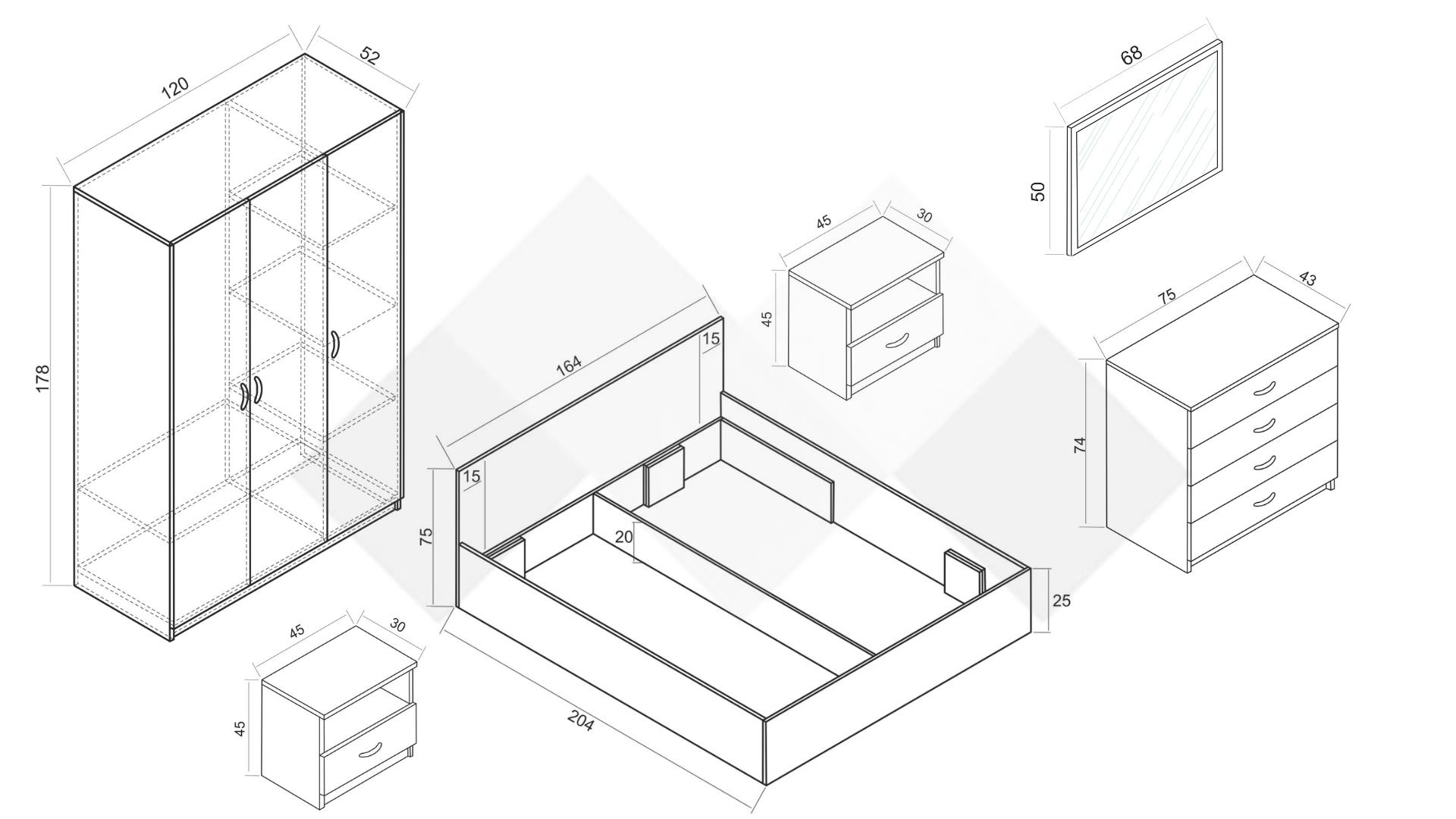 ⭐ Предимства: ✓ спалня за матрак 160/200 ✓ 2 бр. нощни шкафчета ✓ трикрилен гардероб ✓ скрин ✓ огледало ✓ качествена изработка ✓ 16 мм ПДЧ