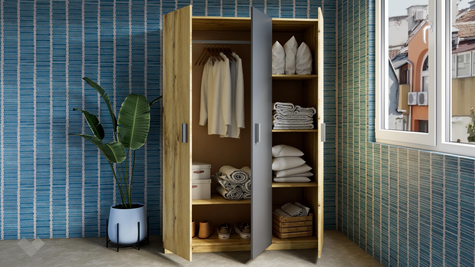 От дясната страна на гардероба ще откриеш три рафта, където да подредиш дрехите, които съхраняваш сгънати – тениски, пуловери, дънки и други. От лявата страна на гардероба са разположени широк рафт и лост за закачалки. Можеш да използваш рафта за организиране на хавлии, спално бельо, възглавници и завивки. Лостът за закачалки е подходящо място за елегантното облекло, което се мачка лесно.