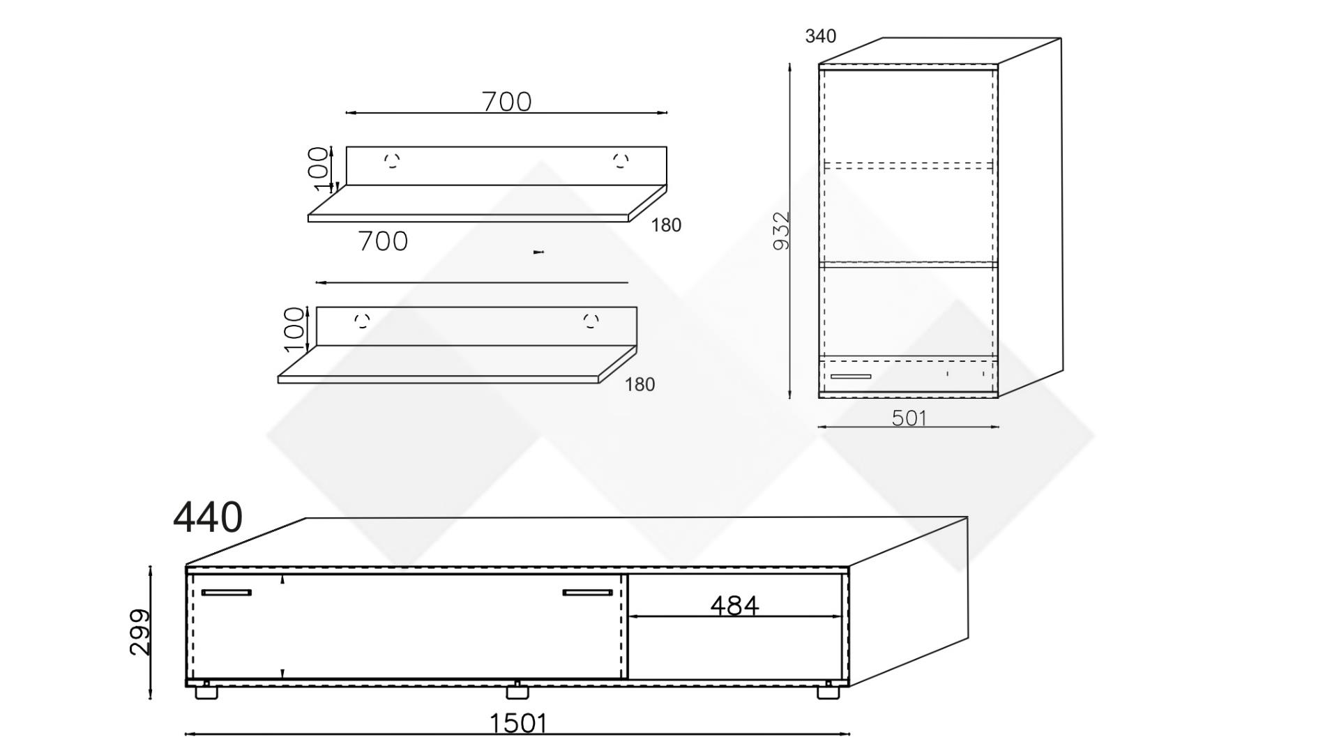 ТВ шкаф: Д: 150 см Ш: 44 см В: 30 см