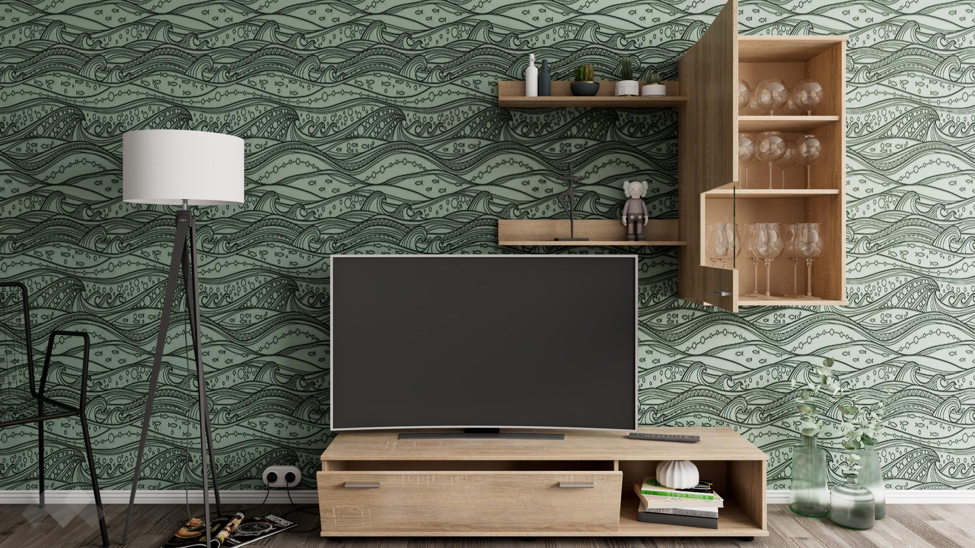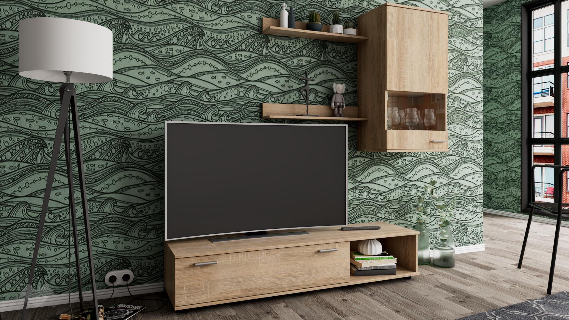 ТВ шкафът се състои от шкаф с падаща врата и отворена ниша. Там можеш да организираш цялата си съпътстваща техника като декодери, плеъри и конзоли. Окаченият шкаф ще приюти сервизите, които използваш най-често, за да са винаги на ръка разстояние. Двете етажерки са прекрасен начин да създадеш допълнително пространство за книги, скъпи спомени като фотографии или сувенири, а може и да аранжираш със стилни декорации и украси – изборът е твой!