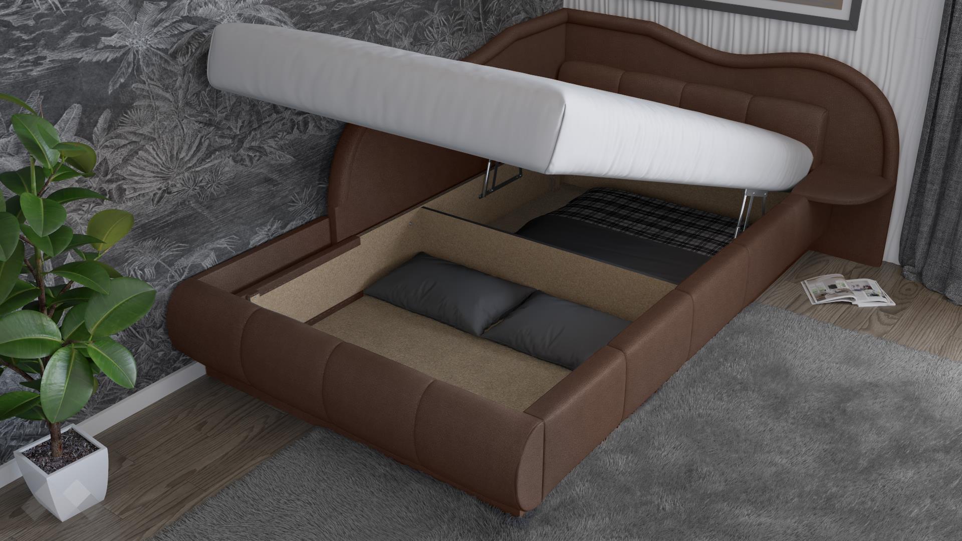 Леглото е с меки форми и елегантен дизайн. Подходящо е за матрак 120/190 см. Под матрака се открива широко пространство, готово да побере всички възглавници и завивки, на които все не намираш място. Така не се налага да закупуваш допълнителни шкафове у дома и пестиш пространство и пари.