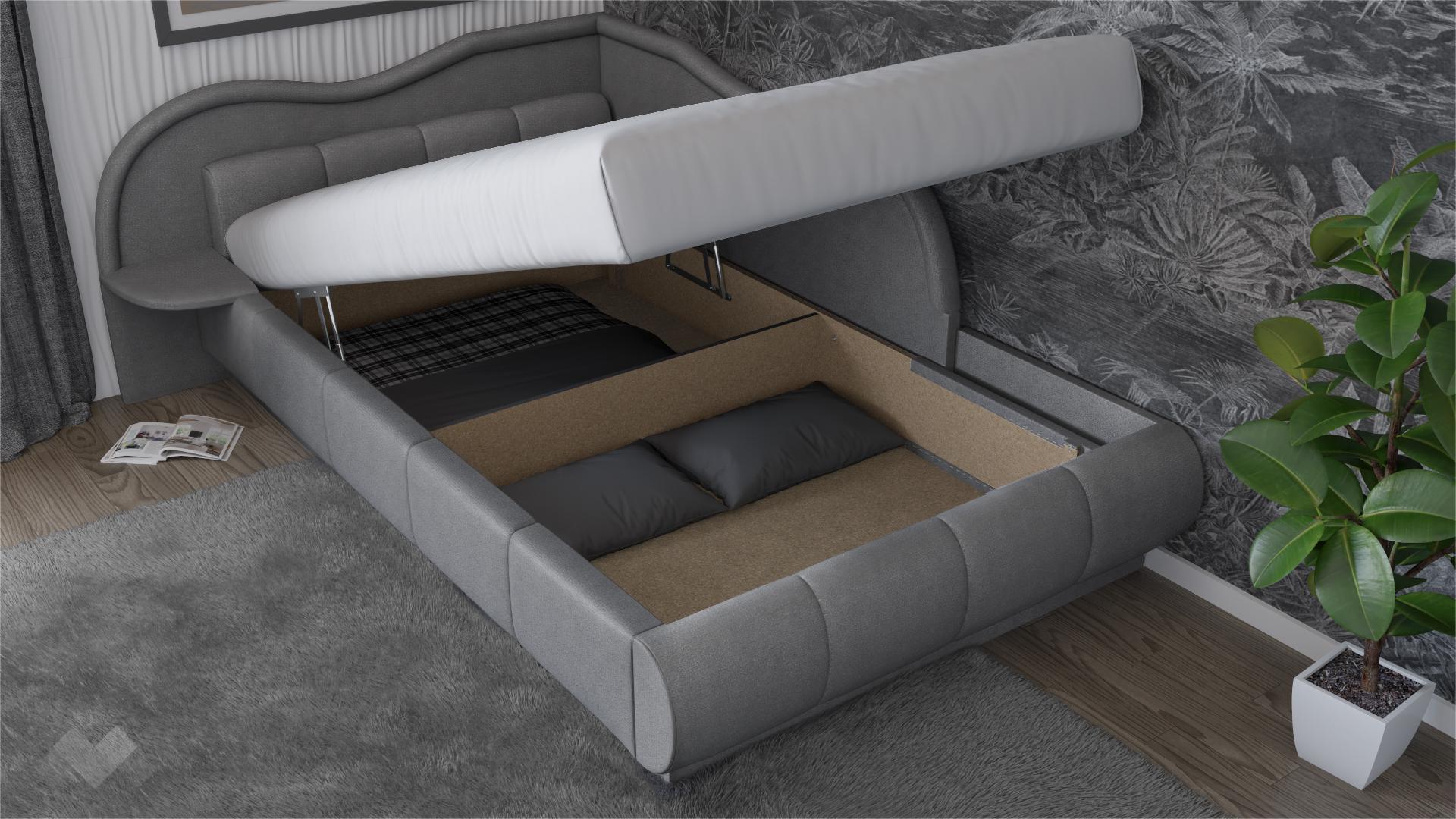 Леглото е с меки форми и елегантен дизайн. Подходящо е за матрак 120/190 см. Под матрака се открива широко пространство, готово да побере всички възглавници и завивки, на които все не намираш място. Така не се налага да закупуваш допълнителни шкафове у дома и пестиш пространство и пари.