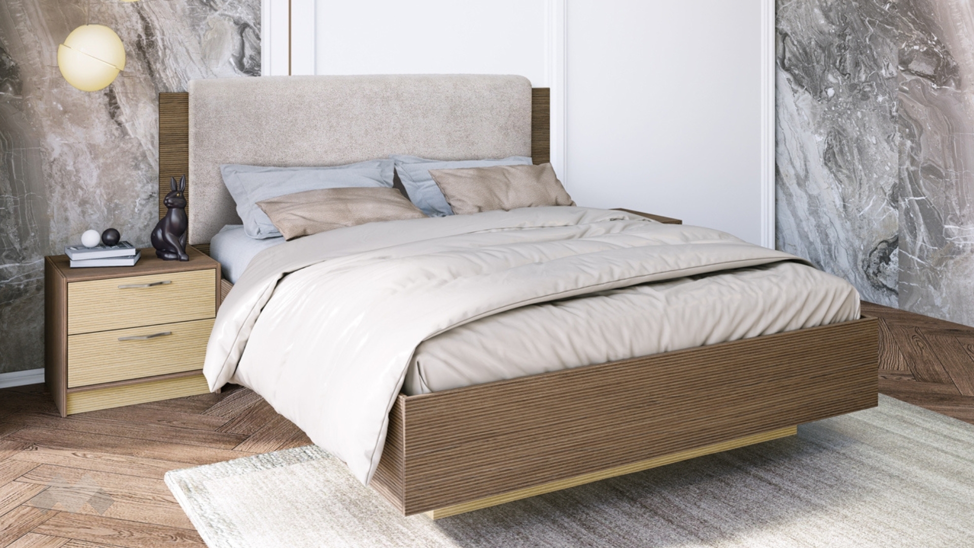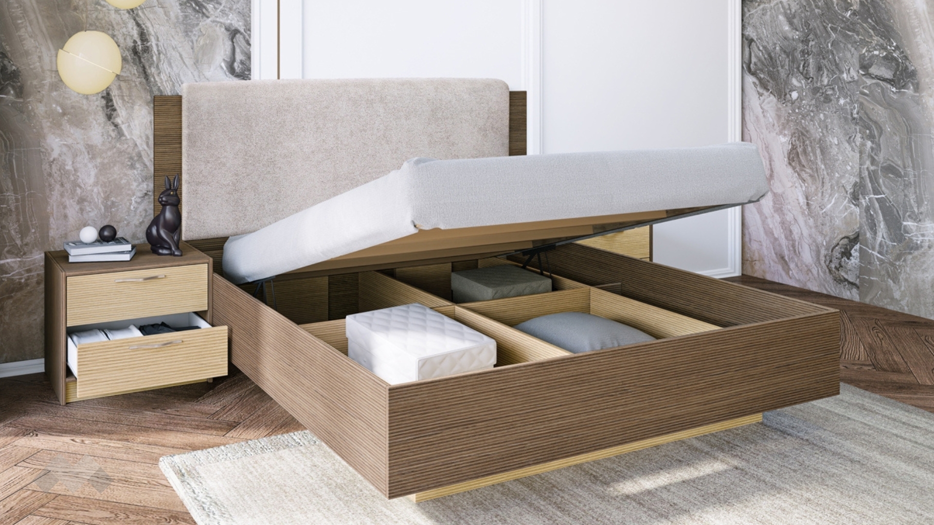 Към спалнята са включени две нощни шкафчета с по две чекмеджета, където да съхраняваш най-необходимите ти вещи и винаги да са под ръка. Чекмеджетата са с механизъм за плавно затваряне. Отгоре можеш да поставиш телефона, любимата книга или недочетеното списание.
