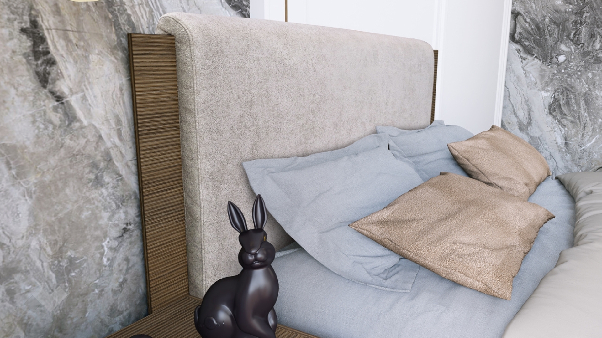 Отличителна черта на тази спалня е високата, тапицирана в топъл светъл цвят, табла. Таблата е достатъчно висока и удобна за облягане при четене на книга или гледане на телевизия. Спалнята е подходяща за матрак с размери 160/200 см. Благодарение на включения механизъм за повдигане на матрака ще разполагаш с допълнително място за съхранение на вещите си.