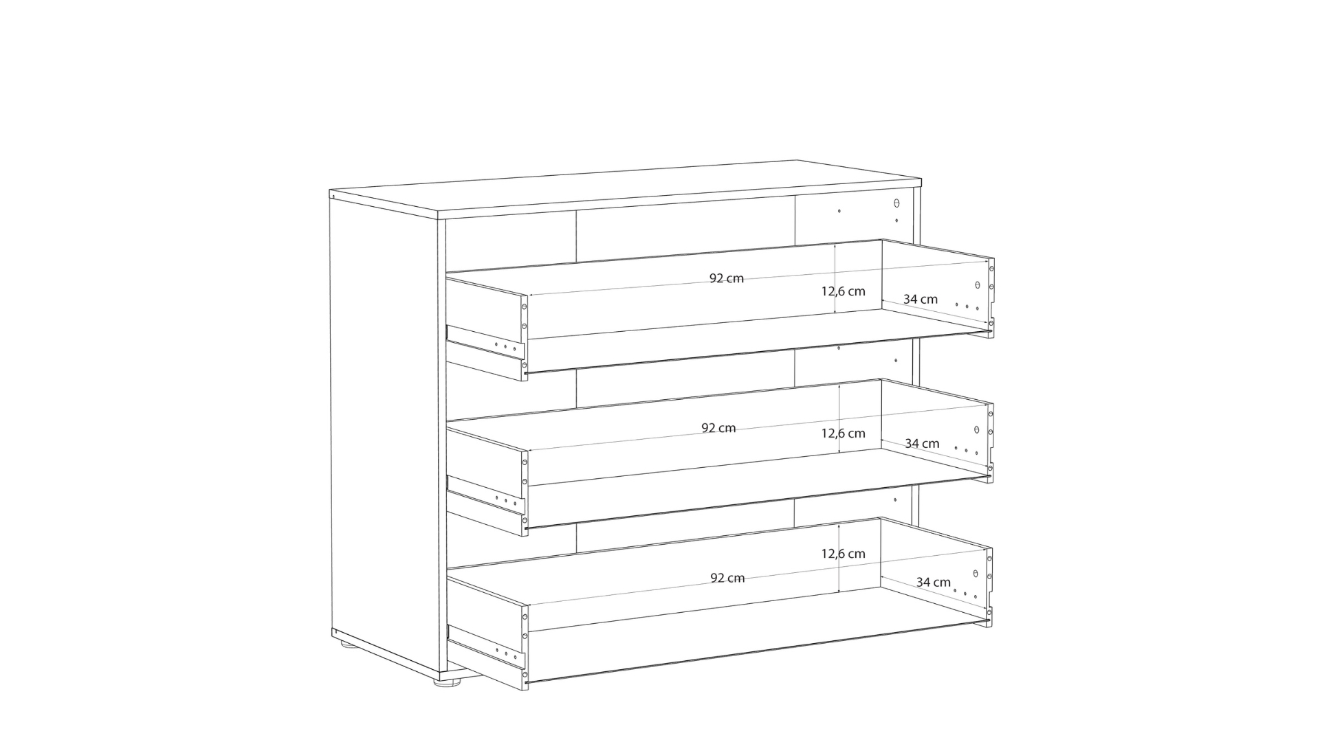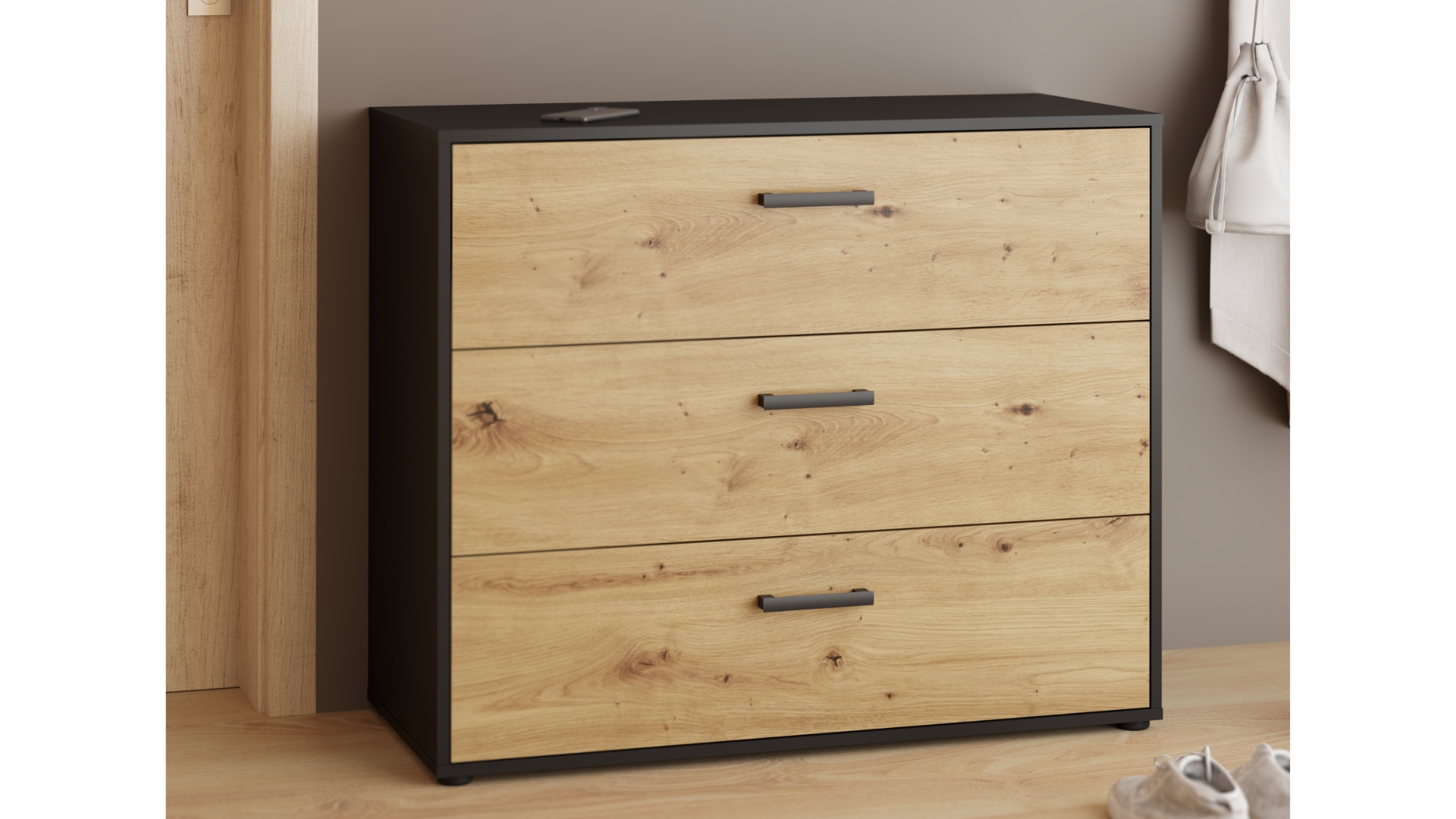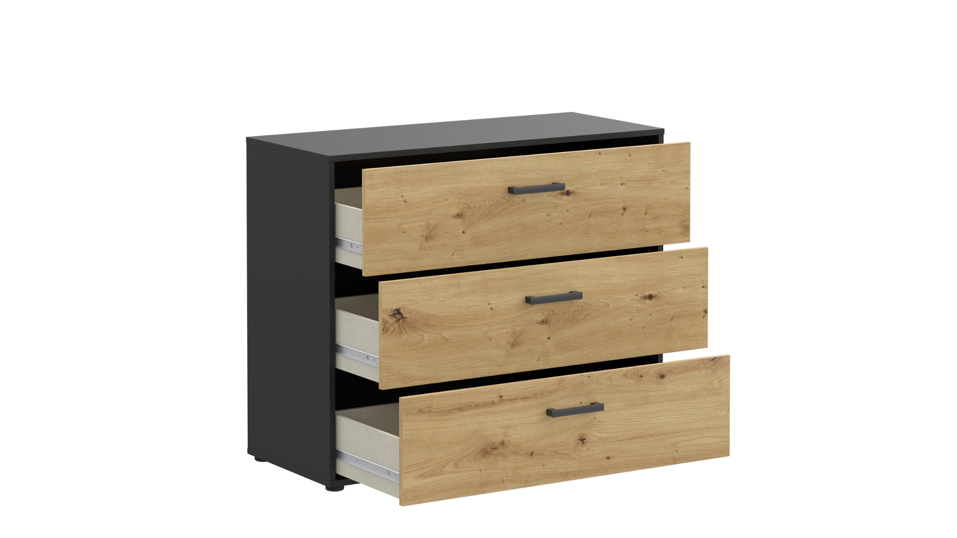 Моделът разполага с три чекмеджета, които предоставят удобно място за съхранение на дрехи, бельо, аксесоари или документи. Горният плот е подходящ за поставяне на декоративни елементи или осветление.