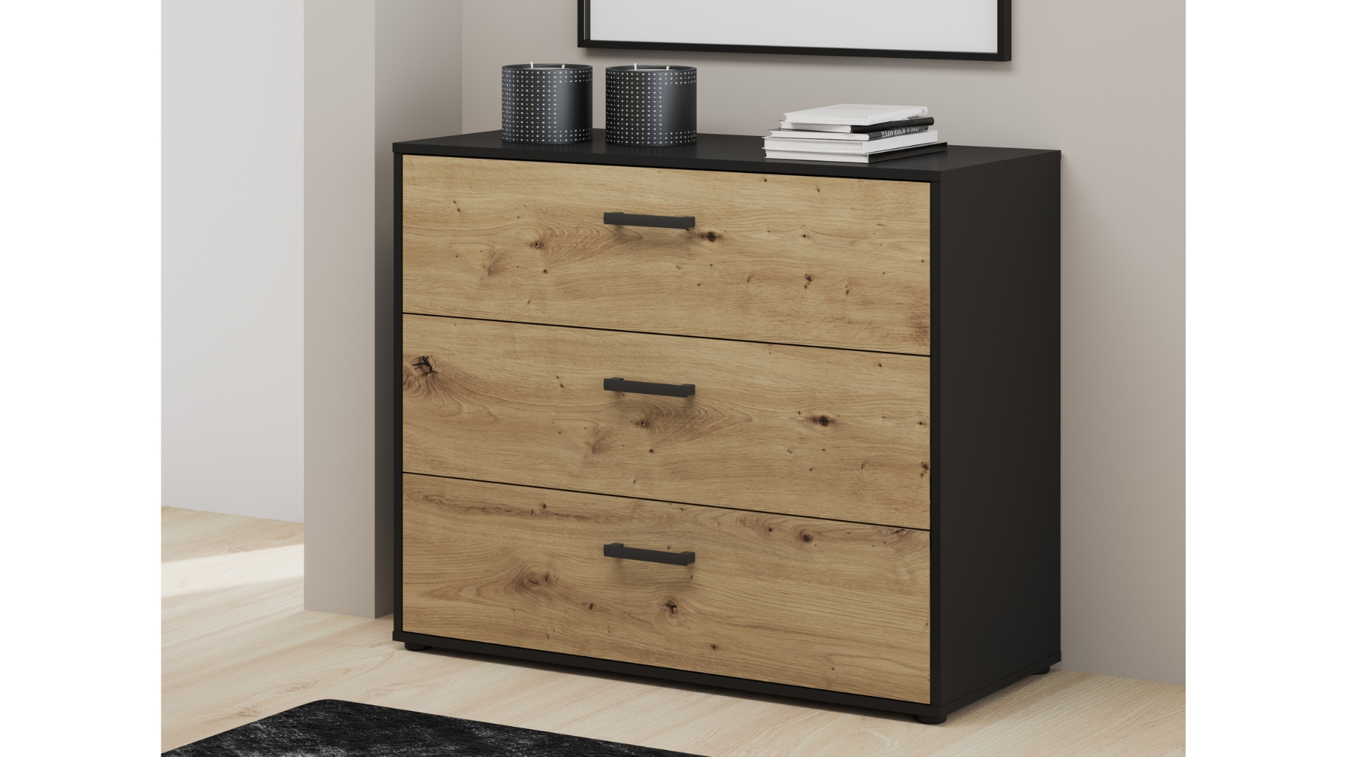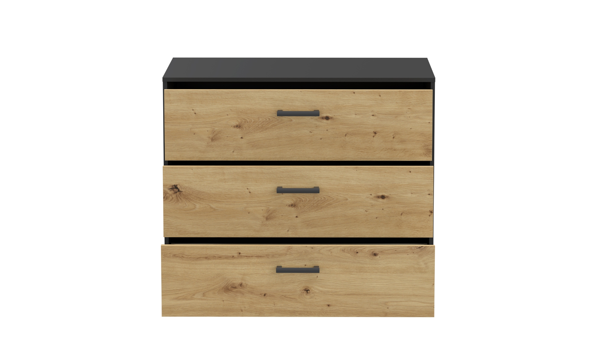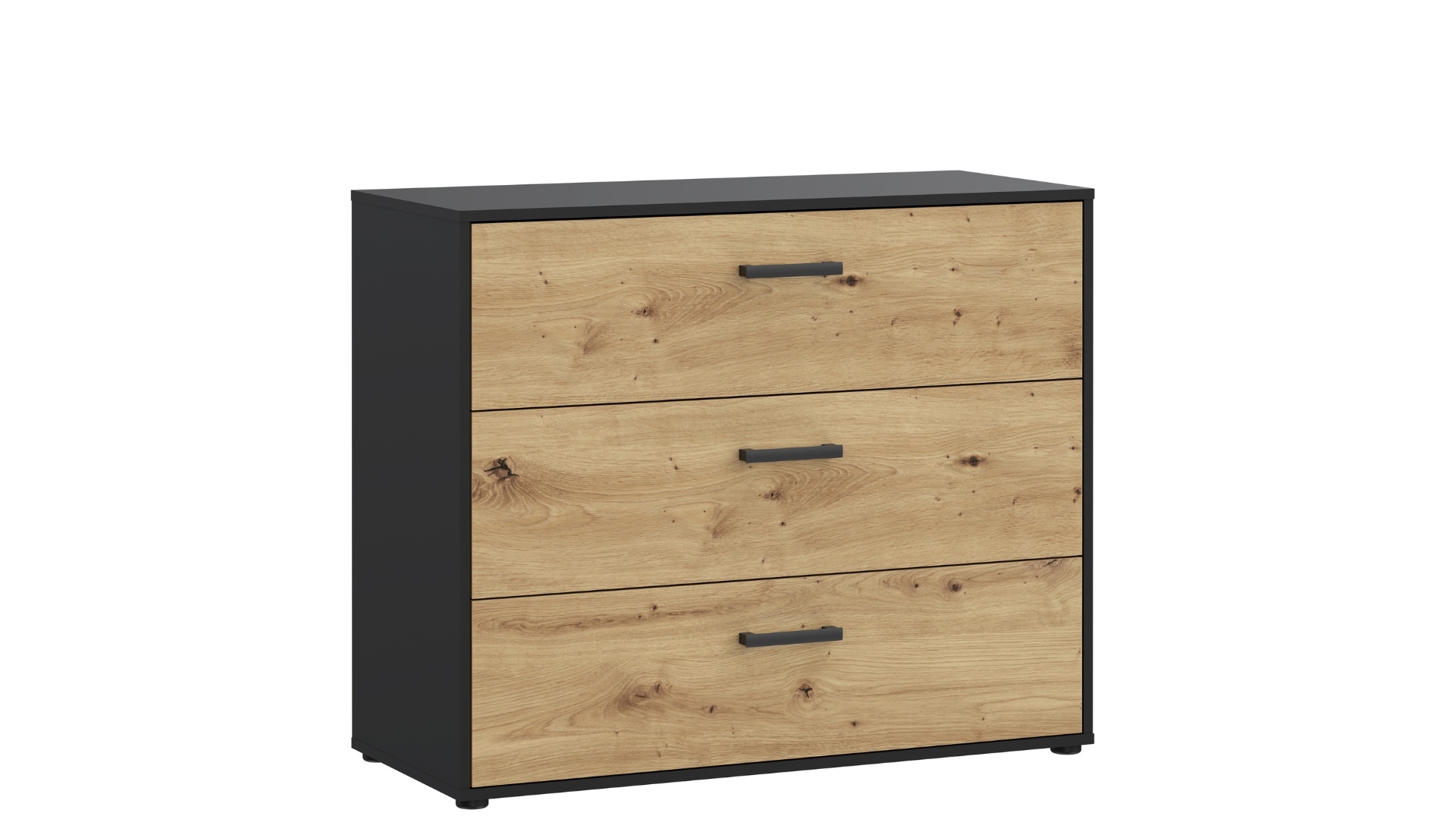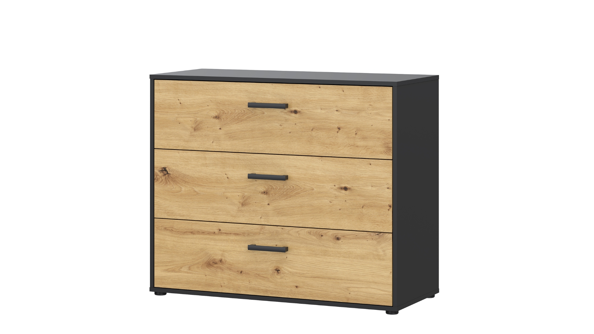 Моделът разполага с три чекмеджета, които предоставят удобно място за съхранение на дрехи, бельо, аксесоари или документи. Горният плот е подходящ за поставяне на декоративни елементи или осветление.
