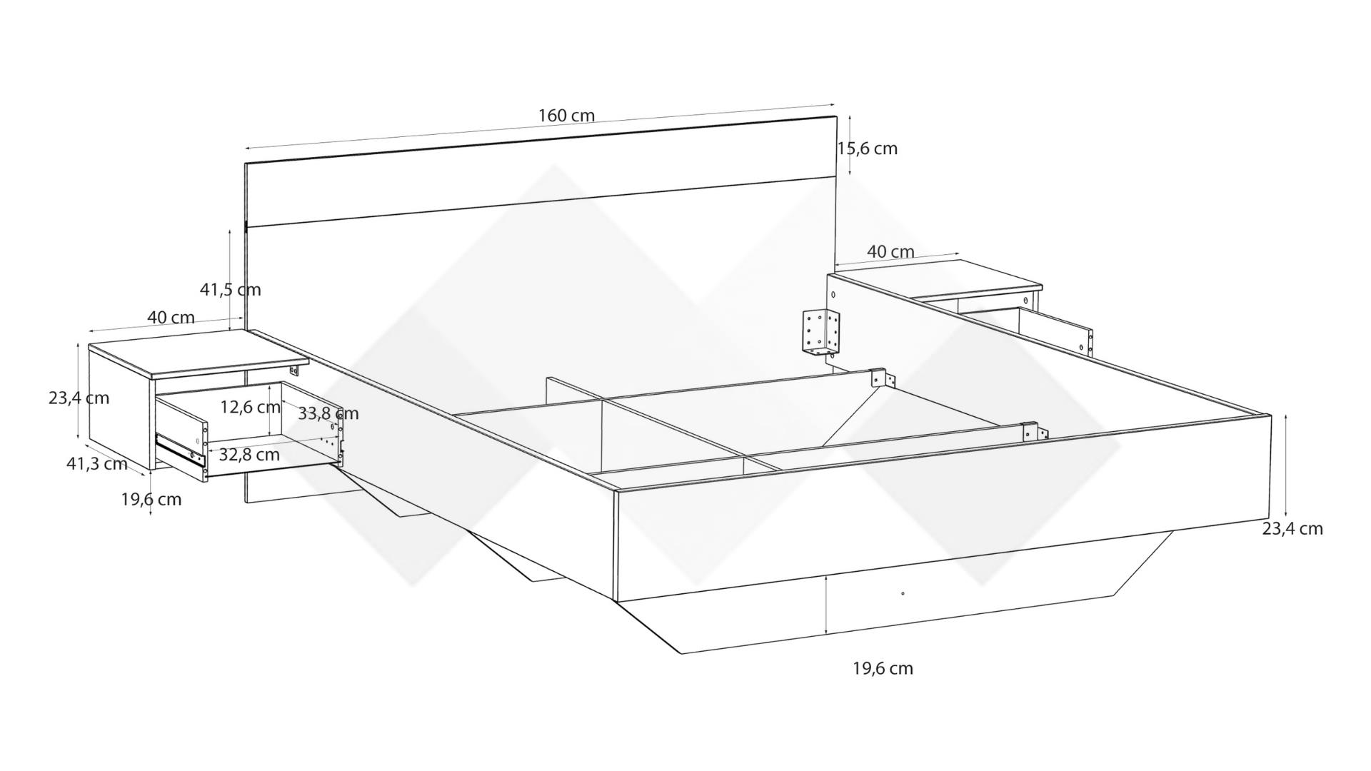 Нощен шкаф (2 бр.): Д: 40 см Ш: 41,3 см В: 23,4 см
