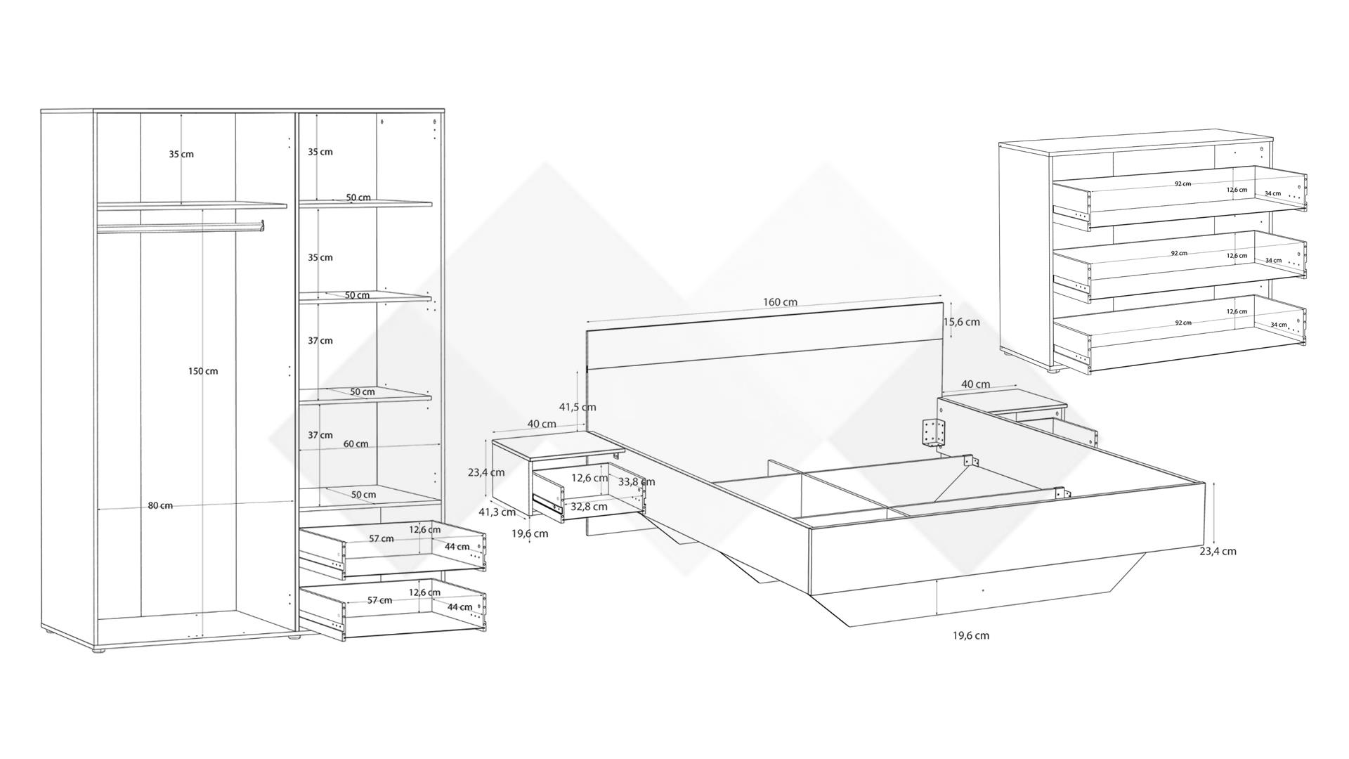 ✓ нощни шкафчета ✓ трикрилен гардероб ✓ скрин ✓ модерен дизайн ✓ здрава конструкция ✓ качествена изработка ✓ 15 мм ПДЧ ✓ за матрак 160/200
