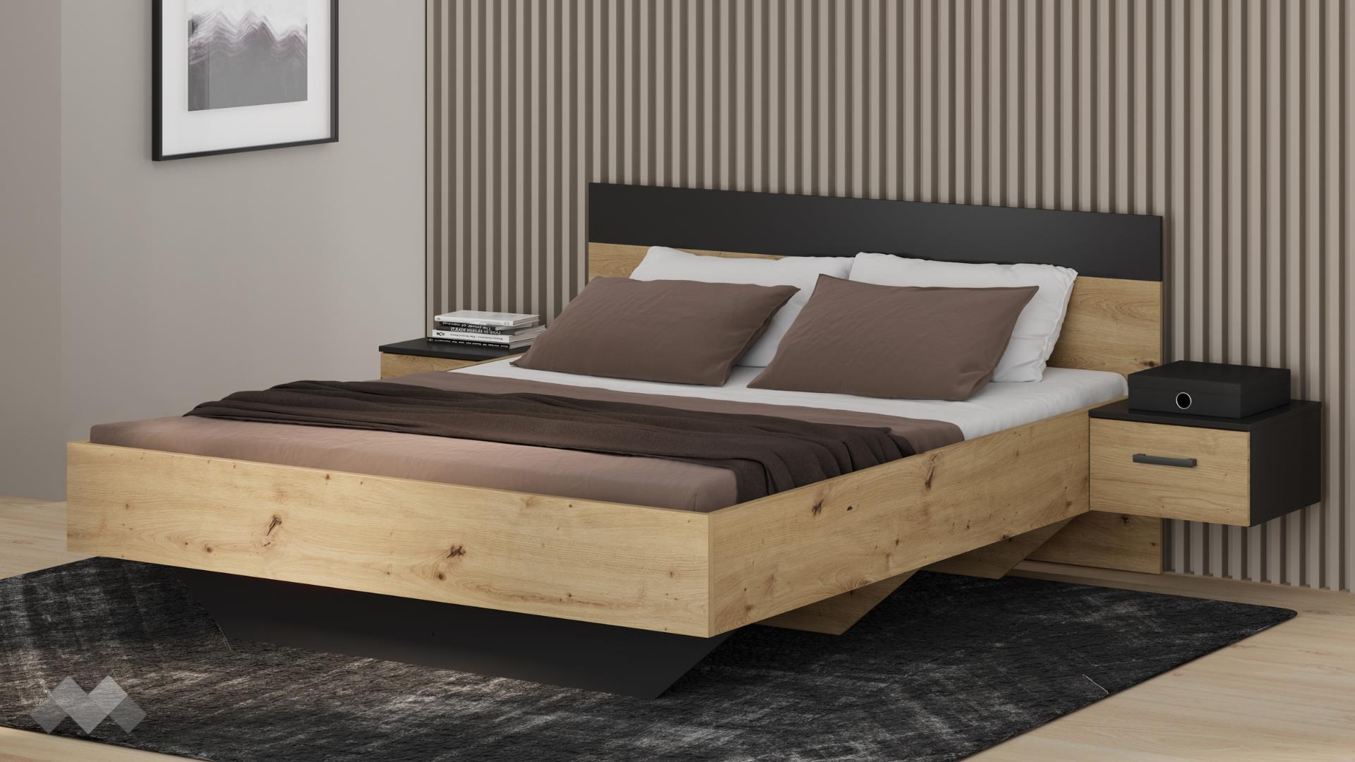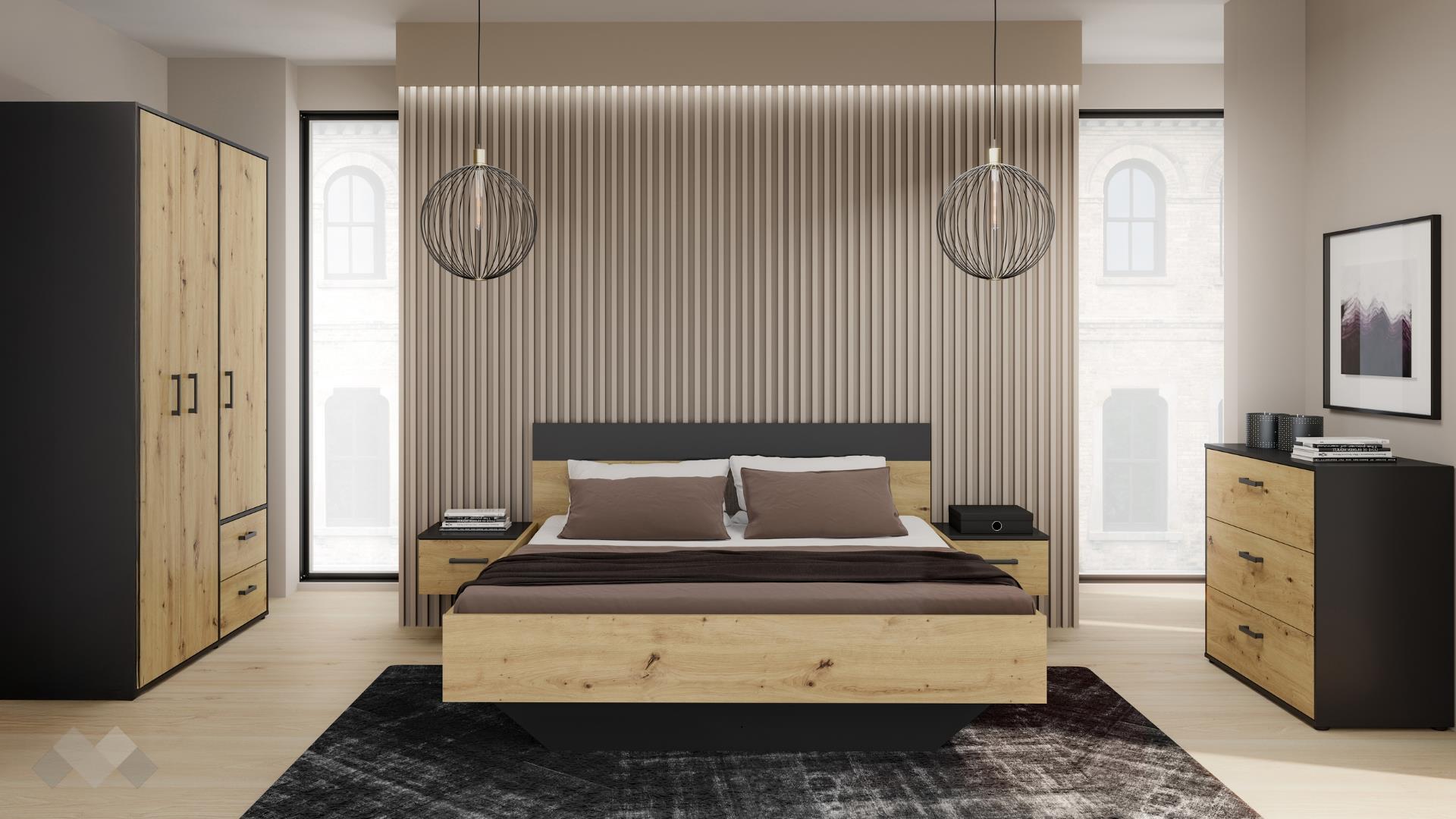 Благодарение на своята елегантна визия, спалнята лесно се комбинира с други мебели и допринася за хармоничната атмосфера в интериора. Нощните шкафчета са изключително практично решение, спестяващо място и осигуряващо удобство за поставяне на нощна лампа, книги или лични вещи директно до леглото.