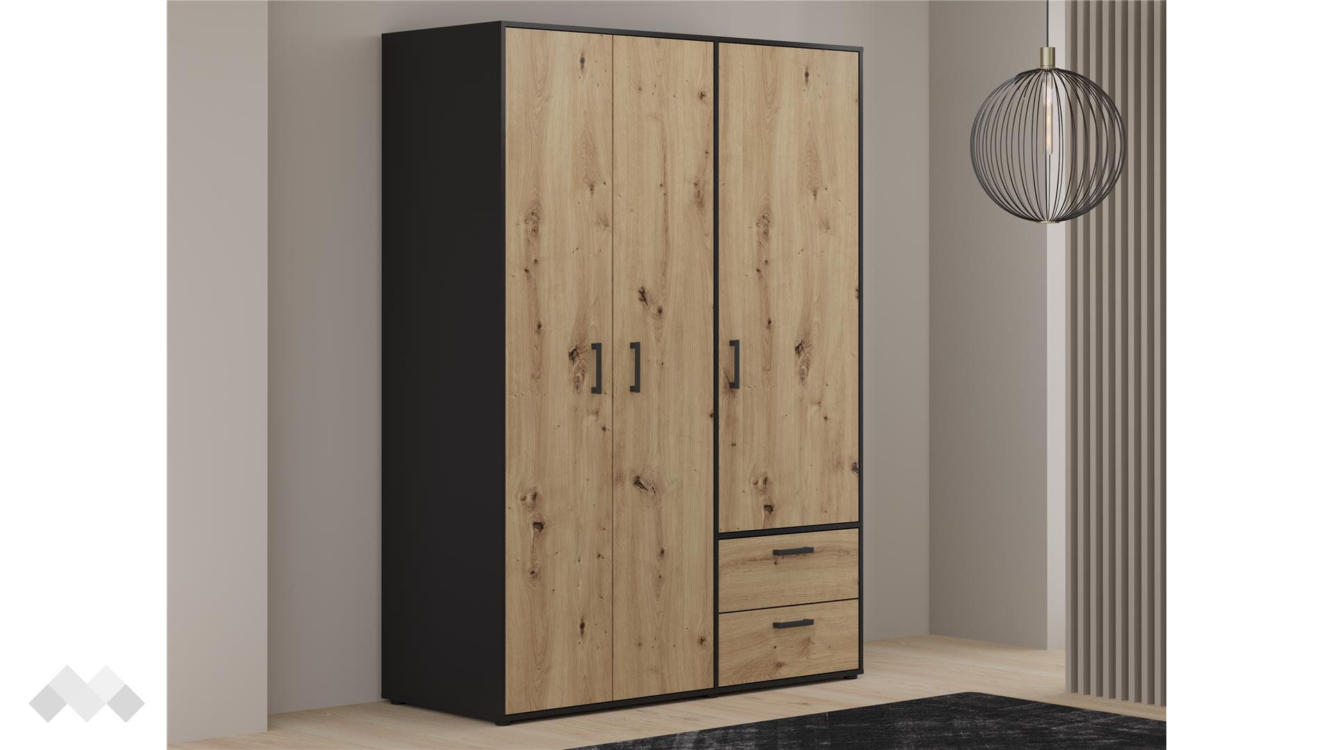 Този трикрилен гардероб впечатлява със своето оптимално разпределение на вътрешното пространство. Той разполага с 4 рафта, които осигуряват достатъчно място за подреждане на сгънати дрехи, спално бельо, кутии и други вещи. В допълнение, гардеробът включва лост за закачалки, идеален за съхранение на по-дълги дрехи като рокли, палта или костюми, предпазвайки ги от намачкване.