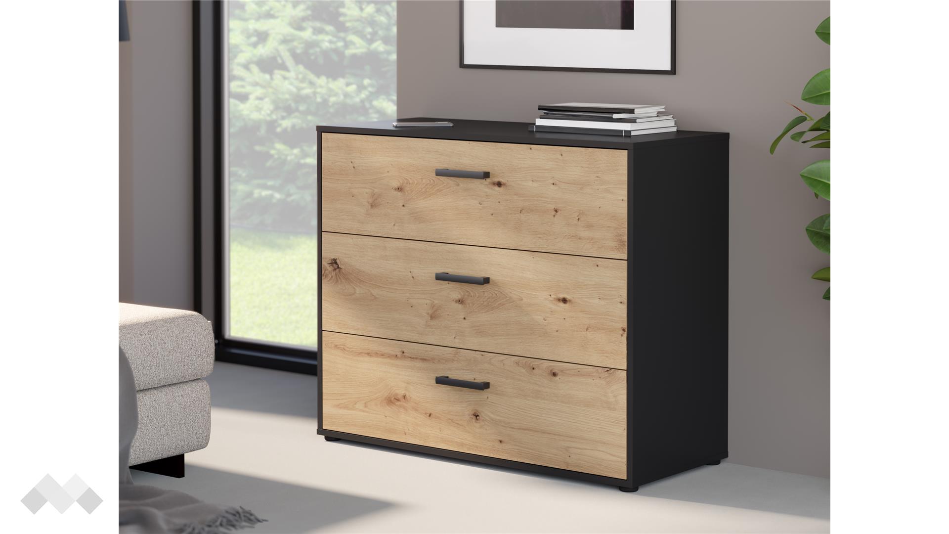 Скринът разполага с три чекмеджета, които предоставят удобно място за съхранение на дрехи, бельо, аксесоари или документи. Горният плот е подходящ за поставяне на декоративни елементи или осветление.