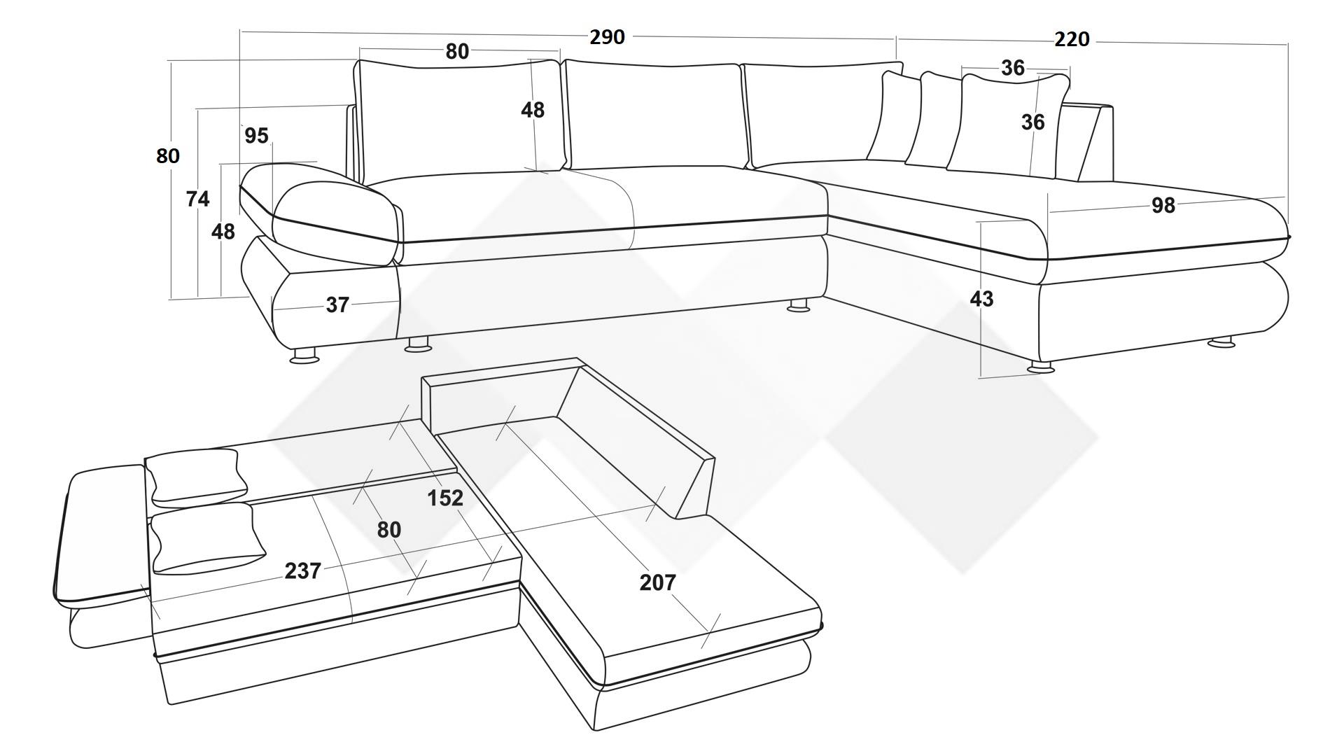 Ъглов диван Монтело съчетава модерен дизайн и практични решения, които го правят отлично допълнение към всеки съвременен интериор. С изчистените си линии и просторна форма, той осигурява уют и комфорт както за ежедневно ползване, така и при нужда от допълнително място за сън.