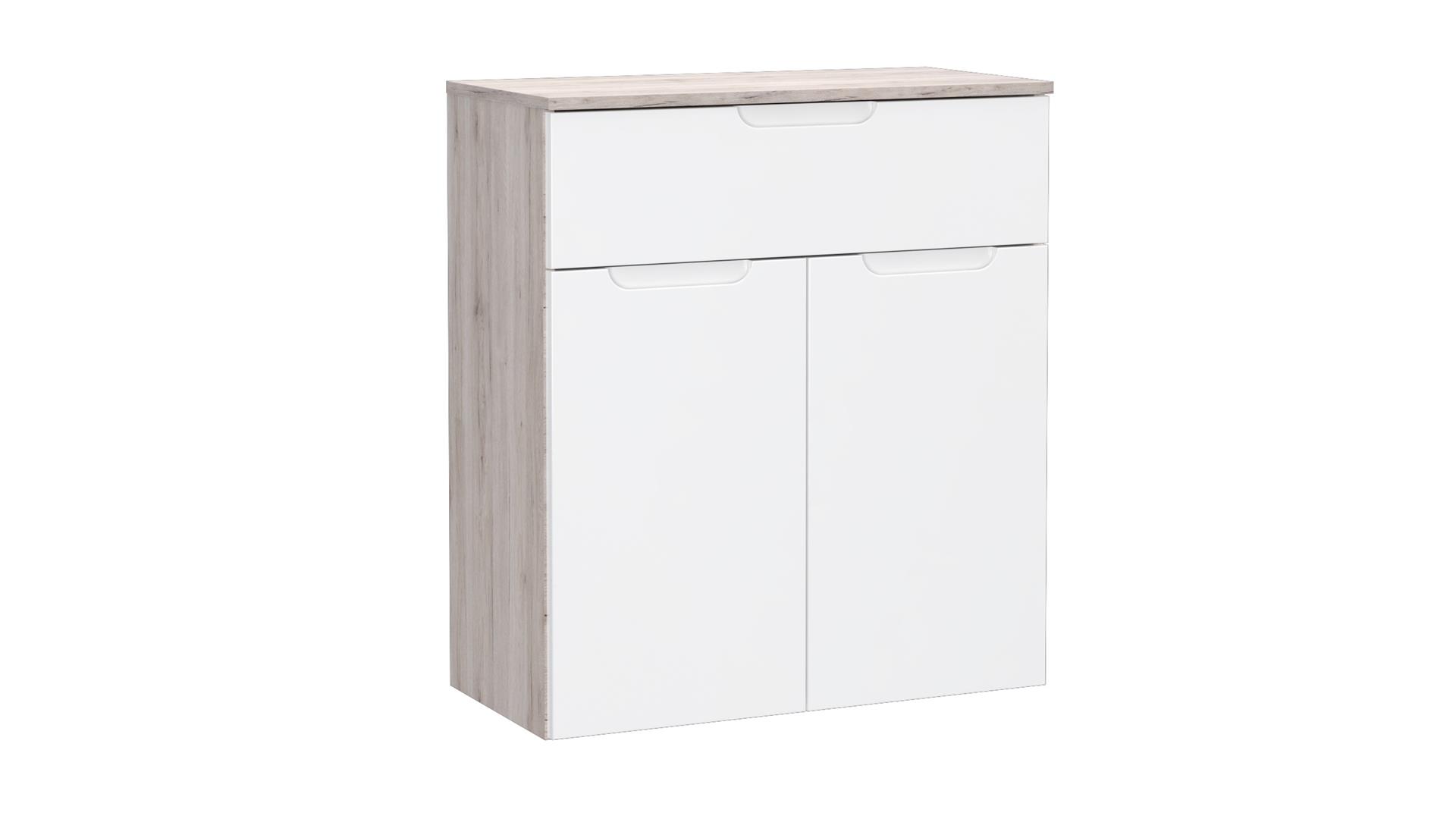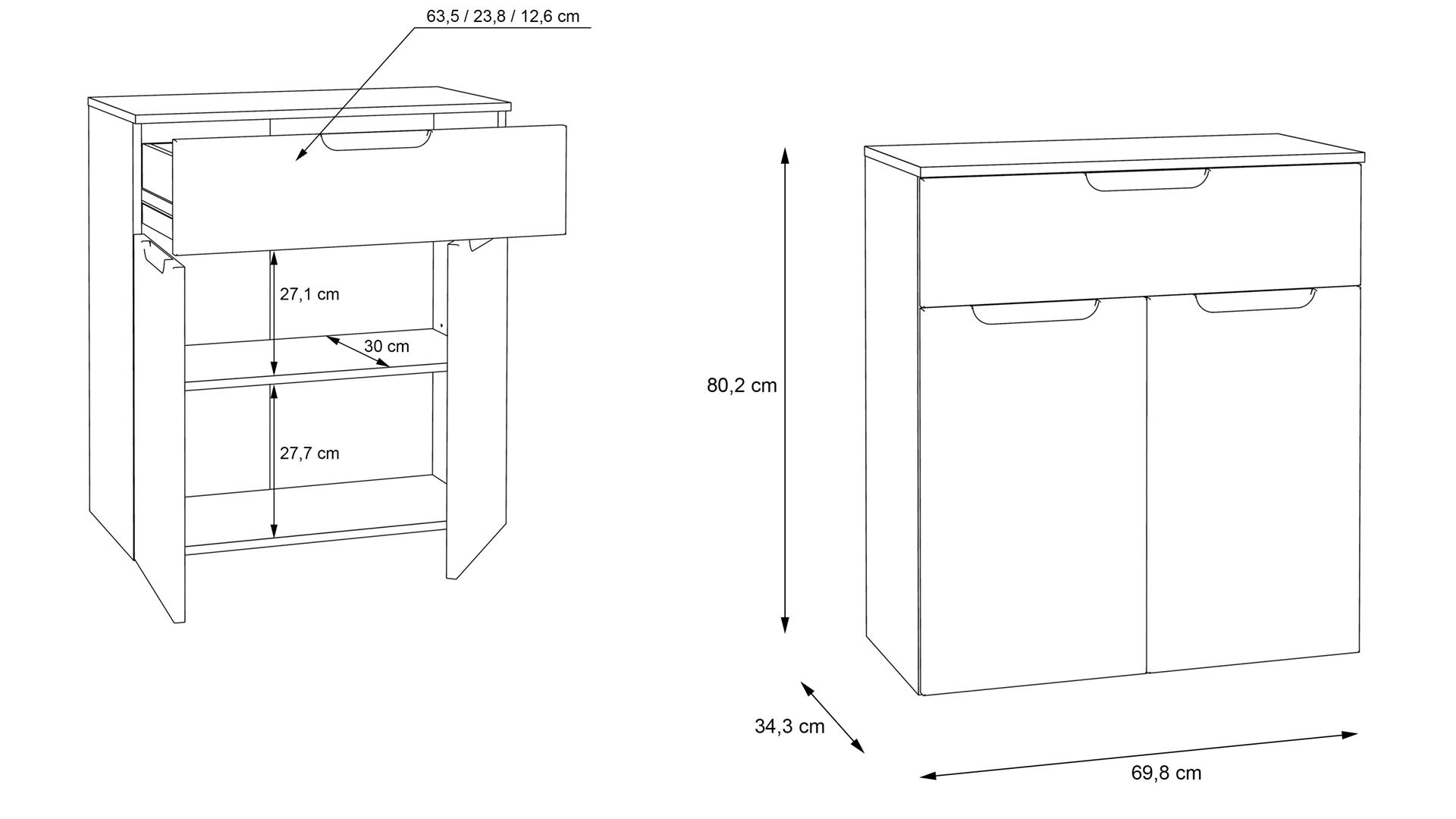 Скрин Морено е компактно и стилно решение за съхранение, подходящо за различни помещения в дома. Разполага с едно чекмедже за по-малки вещи и шкаф с две врати, който осигурява практично място за подредба на по-обемни предмети.