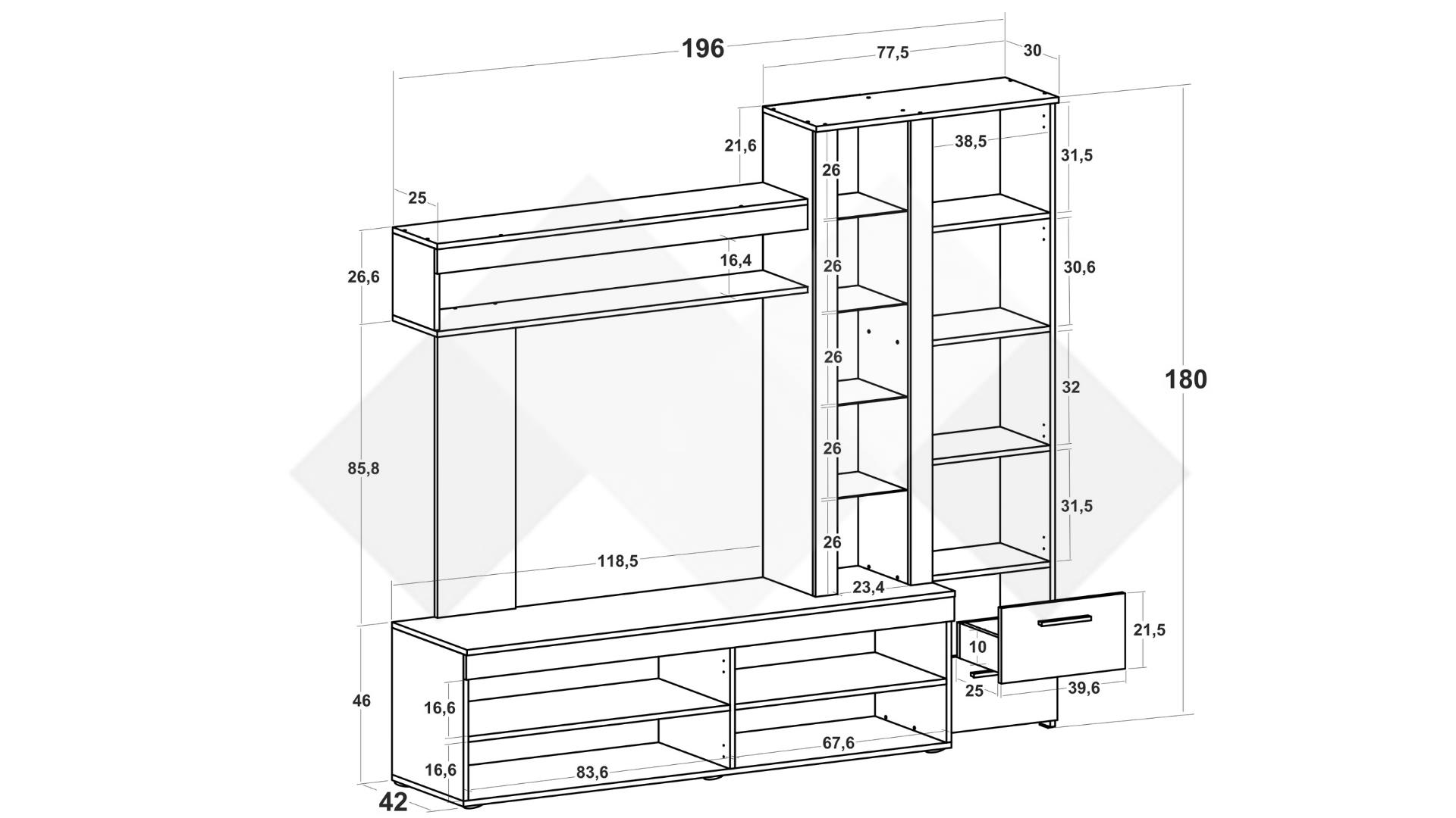 ⭐ Предимства: ✓ място за телевизор✓ етажерка ✓ отворени рафтове ✓ 3 шкафа ✓ две чекмеджета ✓ стилен и практичен дизайн ✓ качествена изработка ✓ 16 мм ПДЧ