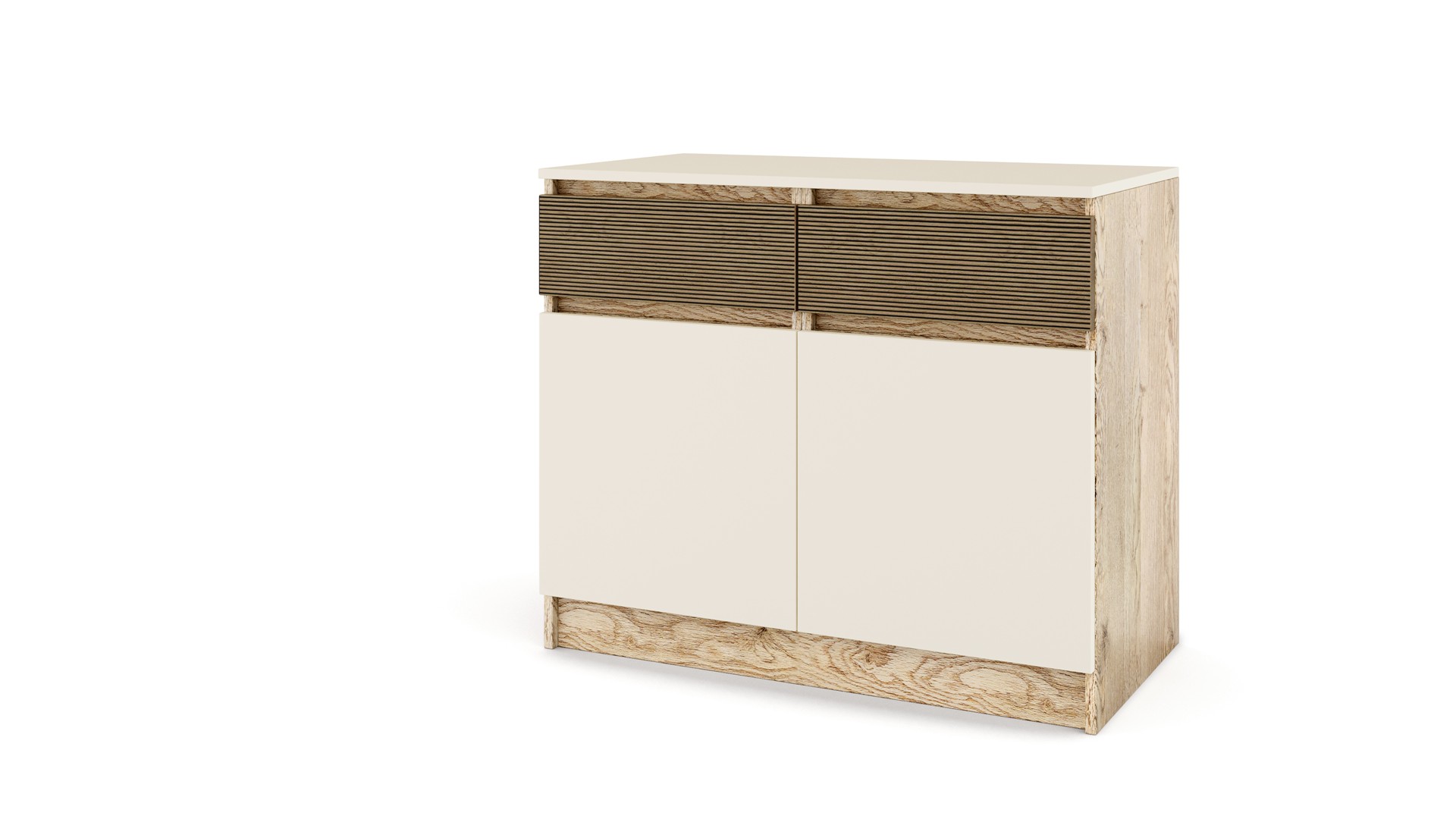 Скринът разполага с две просторни чекмеджета, които предлагат обширно място за съхранение на бельо, аксесоари или други лични вещи. Чекмеджетата се движат плавно и безшумно, осигурявайки лесен достъп до съдържанието им. Двата шкафа с вратички предоставят допълнително пространство за съхранение на дрехи, книги или други предмети, които искаш да бъдат организирани и лесно достъпни. Вътрешните рафтове в шкафовете осигуряват оптимално използване на пространството.