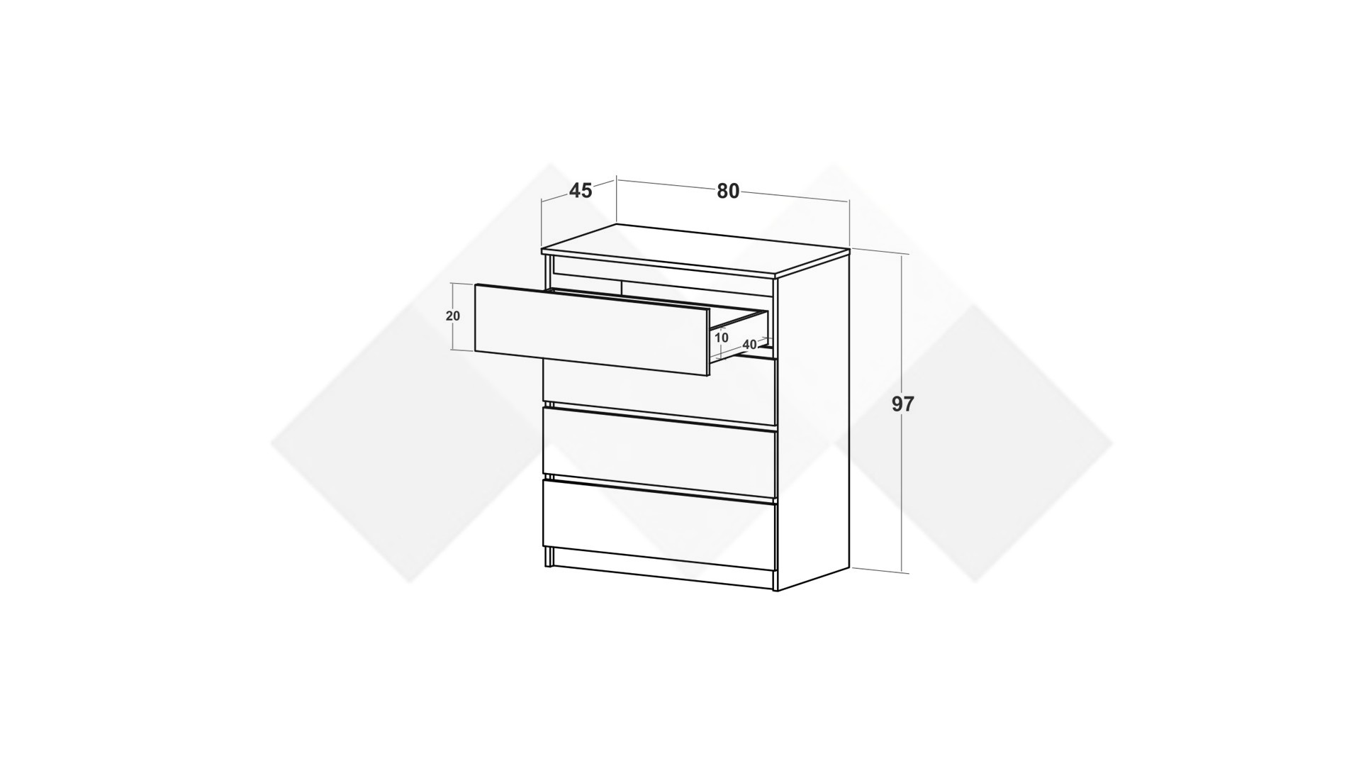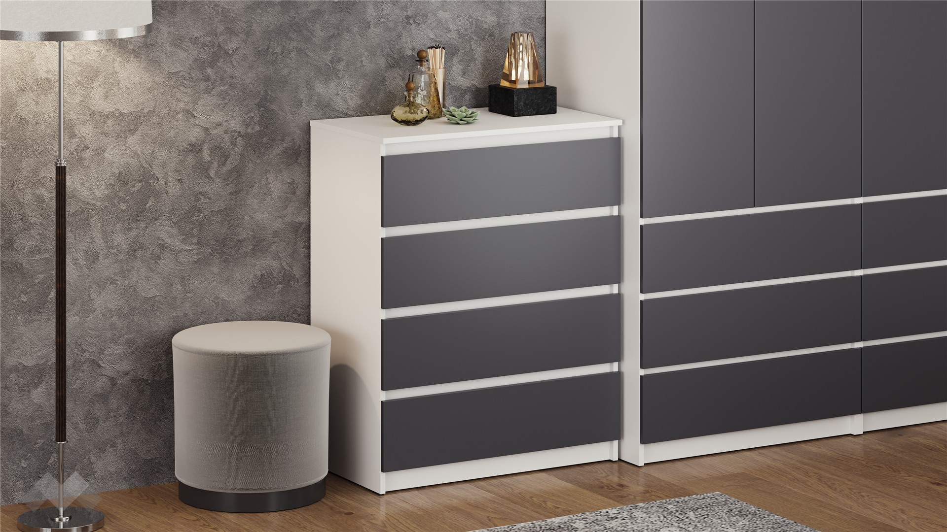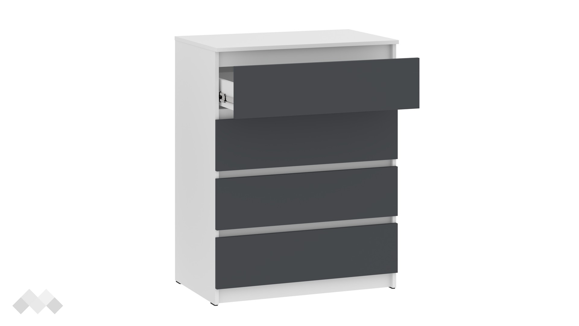 На твое разположение са четири чекмеджета, подходящи за организиране на дрехи, бельо, малки ел. уреди, аксесоари или други необходими за теб неща. Предимството, с което разполага скрин Никола, са телескопичните водачи на чекмеджетата – те са по-здрави и издържливи във времето.