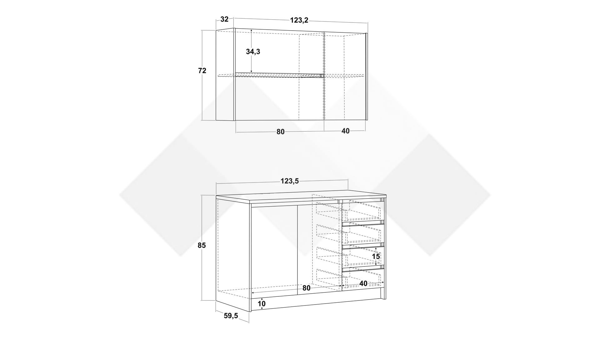 Горен модул: Д: 123,2 см. Ш: 32 см. В: 72 см.