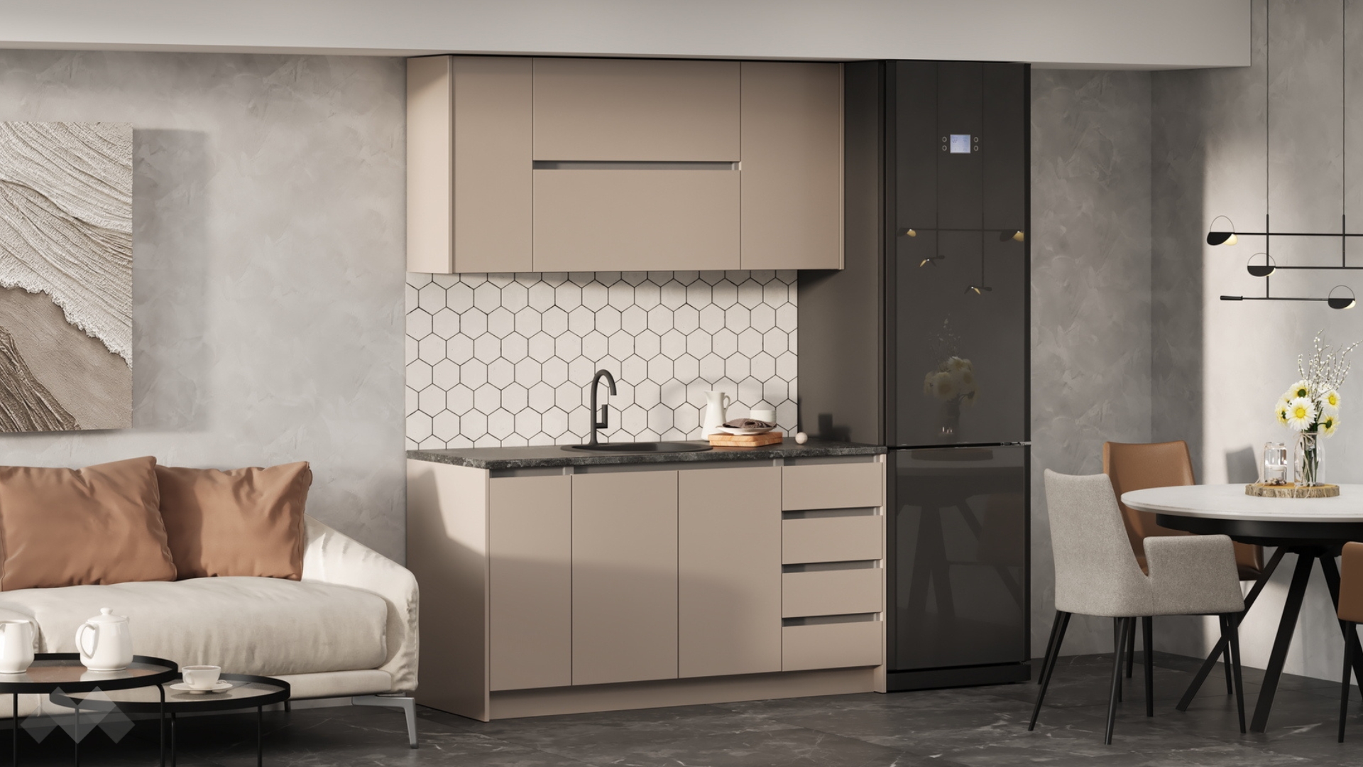 Елегантната комбинация от кашмир със сиво и плот в декор - тъмен бетон,придава изискан характер, а функционалните шкафове и чекмеджета осигуряват достатъчно място за всичко необходимо.