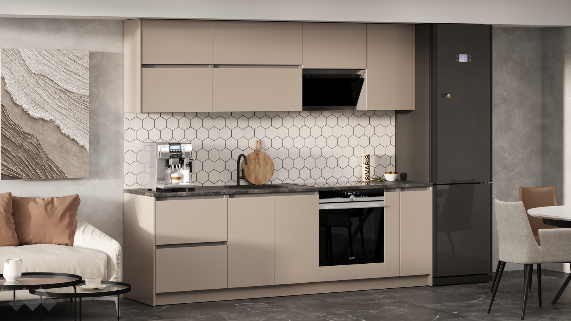 Елегантната комбинация от кашмир със сиво и плот в декор - тъмен бетон,придава изискан характер, а функционалните шкафове и чекмеджета осигуряват достатъчно място за всичко необходимо.