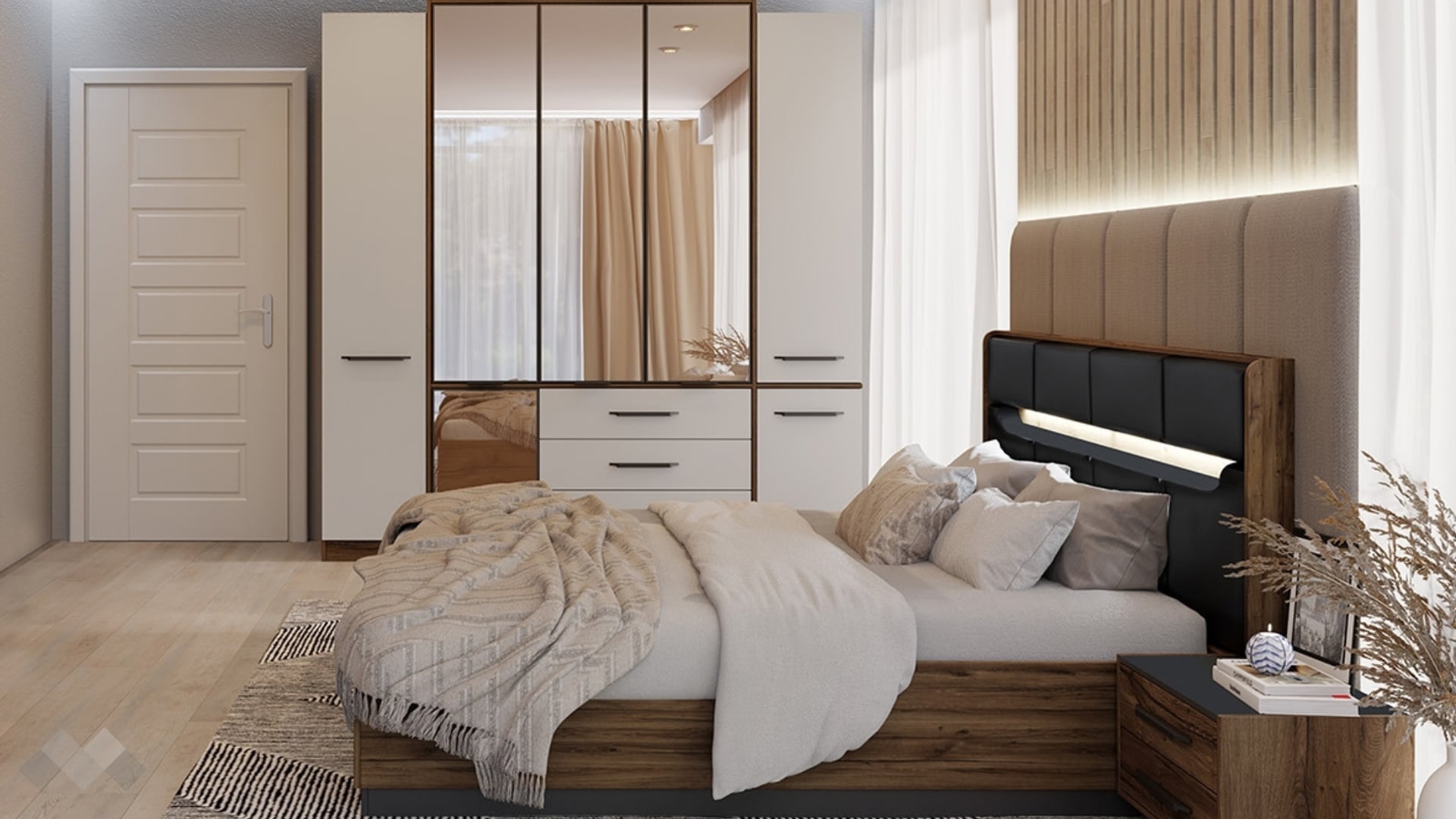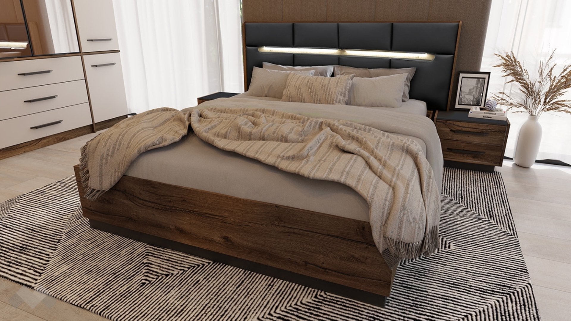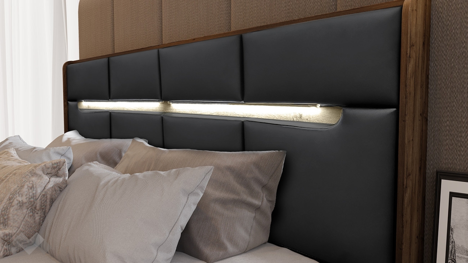 Спалнята е със стабилна конструкция и изчистен дизайн. Високата табла е с тапицирана част в черна ЕКО кожа, която добавя усещане за мекота, комфорт и стил. Рамката внася топлина, а размерът е подходящ за матрак 160/200, осигурявайки удобство и естетика. Впечатляващият акцент на спалнята и нейната табла е вграденото LED осветление, с което намаш нужда от нощна лампа.