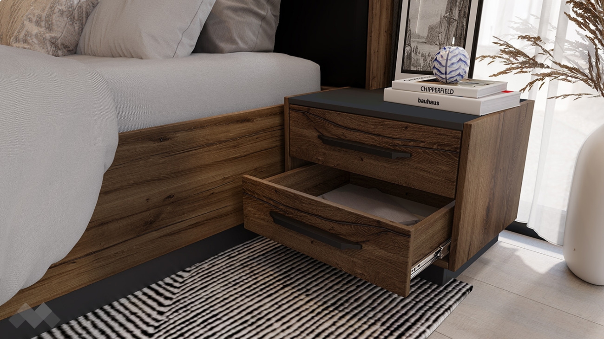 Нощните шкафчета са компактни и функционални, с две чекмеджетата за съхранение на най-необходимите вещи. Дизайнът им е в пълна хармония с леглото и гардероба, което допринася за единна и стилна визия на цялото обзавеждане.
