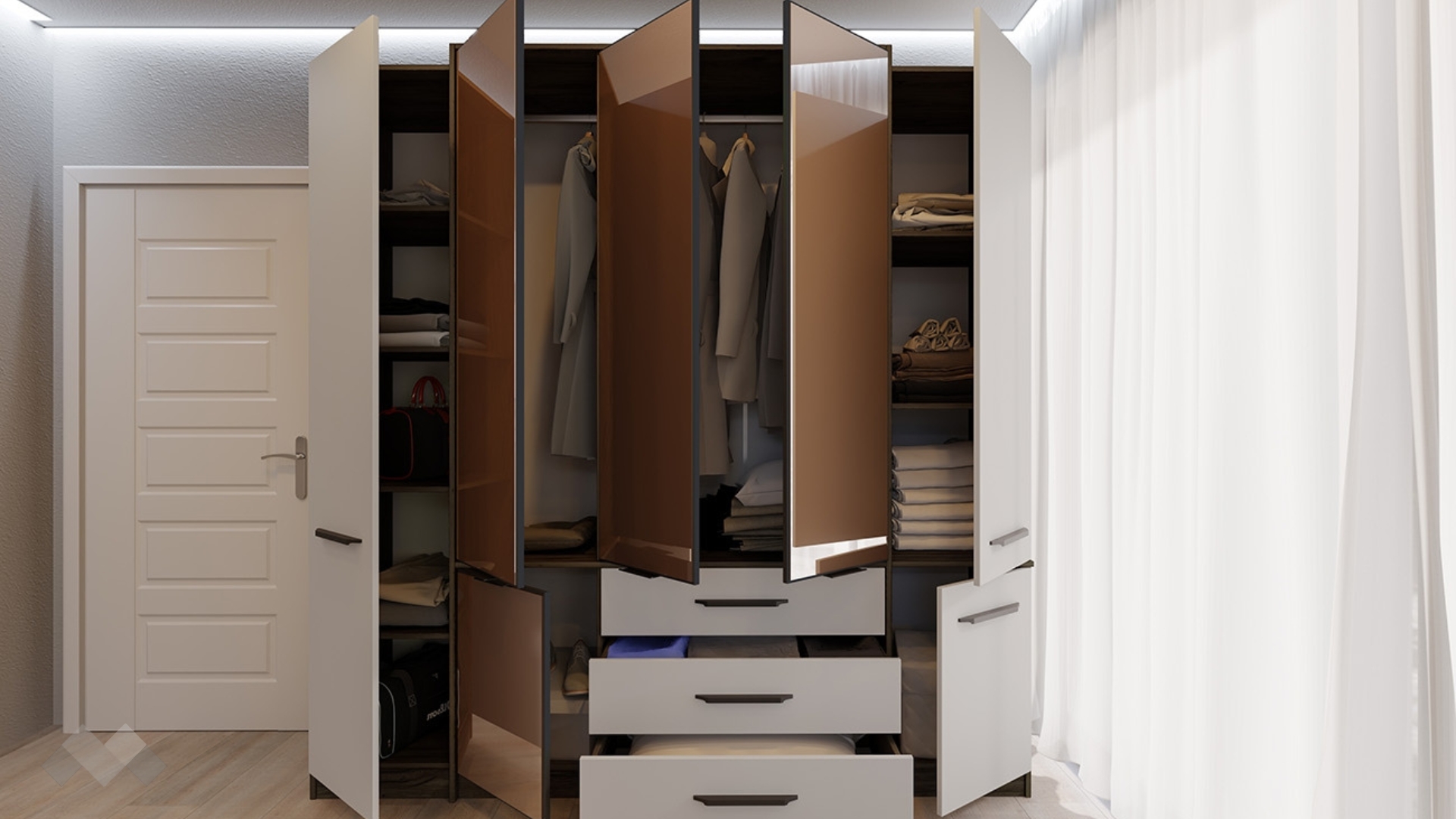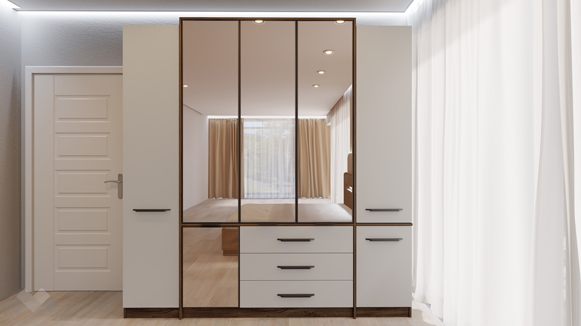 Гардеробът е петкрилен – практично и модерно решение за всяка спалня. Вътрешното пространство е оптимално разпределено, осигурявайки достатъчно място за подредба на дрехи и аксесоари. Разполага с три големи чекмеджета, шест рафта и два лоста за закачалки.