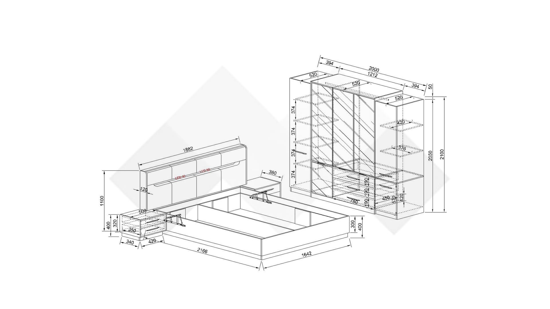 Спалният комплект е с включен механизъм за повдигане на матрака.