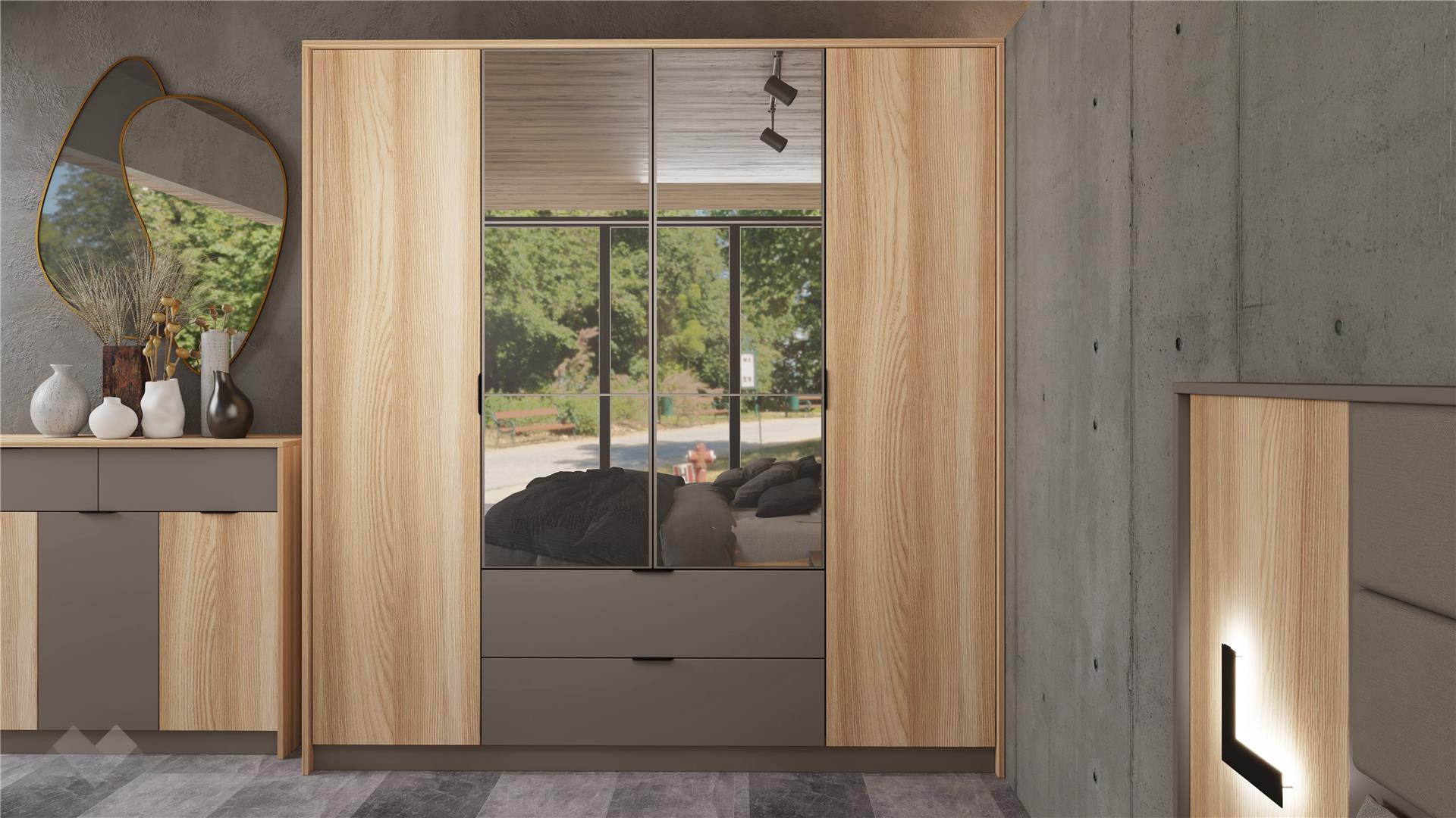 Четирикрилният гардероб е проектиран с мисъл за практичност. Той разполага с рафтове, лостове за закачалки и две чекмеджета за по-дребни вещи, предоставяйки отлично организирано вътрешно пространство. Двойното огледало, съставено от няколко ефектни части, придава стил и визуално разширява помещението.