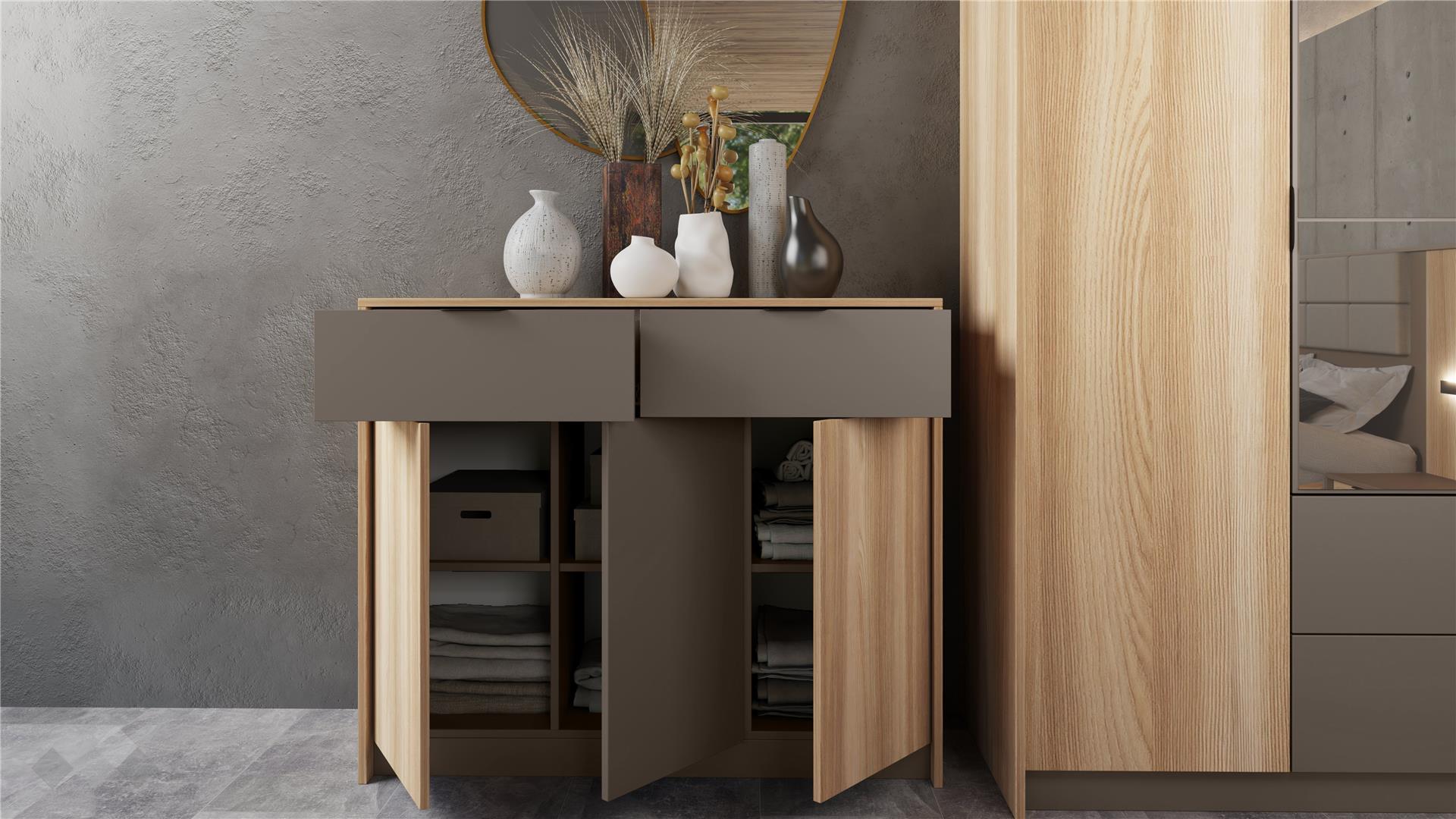 Скринът с три врати и две чекмеджета предлага обширно място за съхранение. Вратите имат механизми за плавно затваряне, които осигуряват тишина и удобство при употреба. Чекмеджетата са снабдени с телескопични сачмени водачи и се изтеглят до край за лесен достъп до съдържанието, като същевременно гарантират дълготрайна устойчивост.