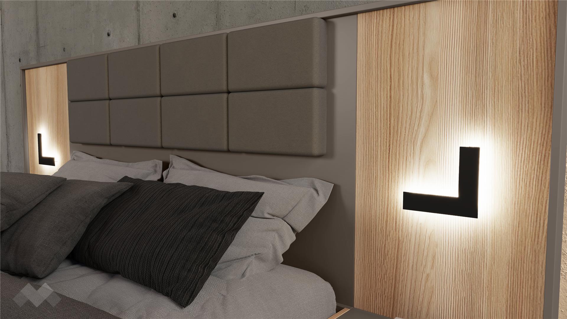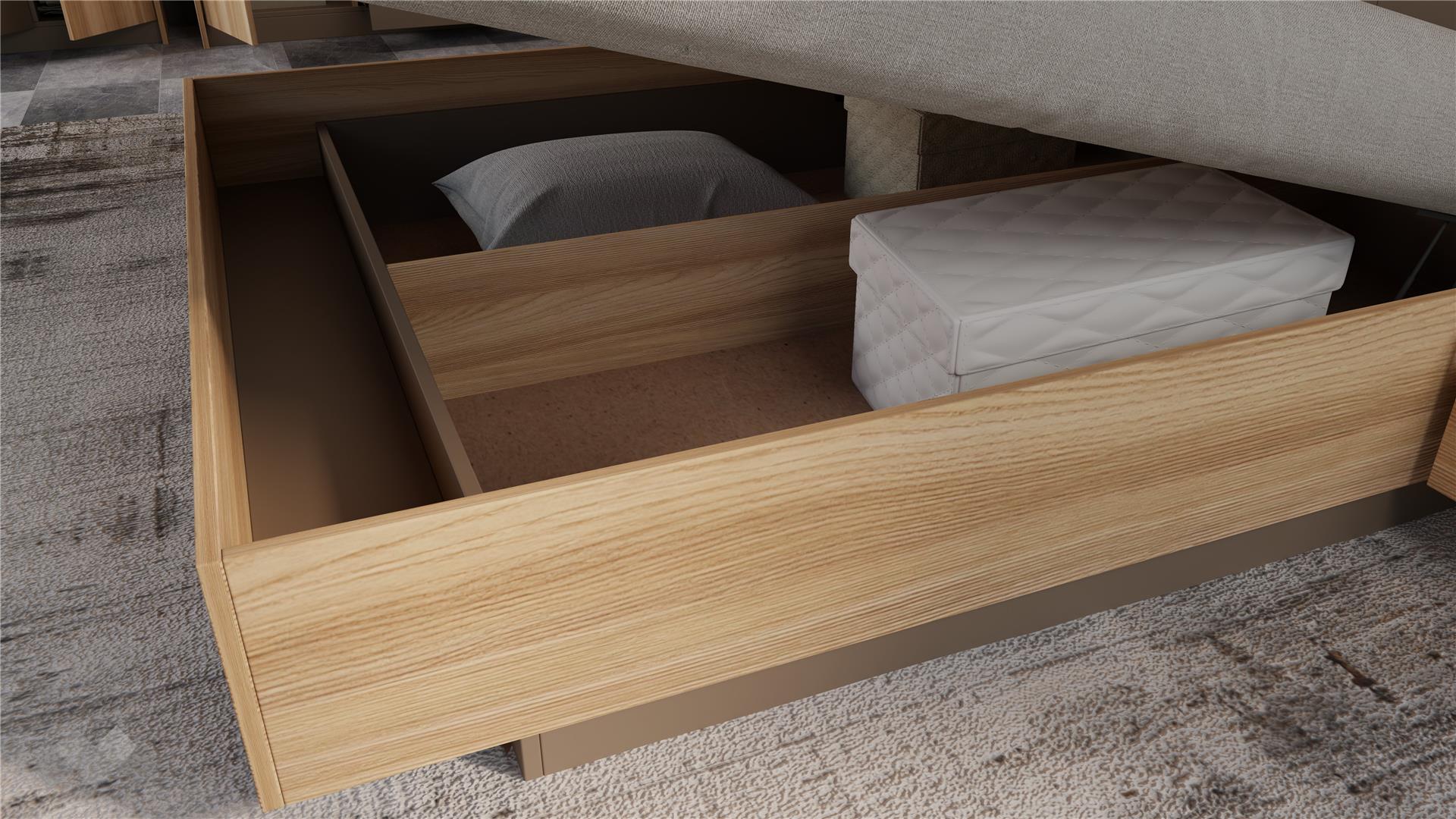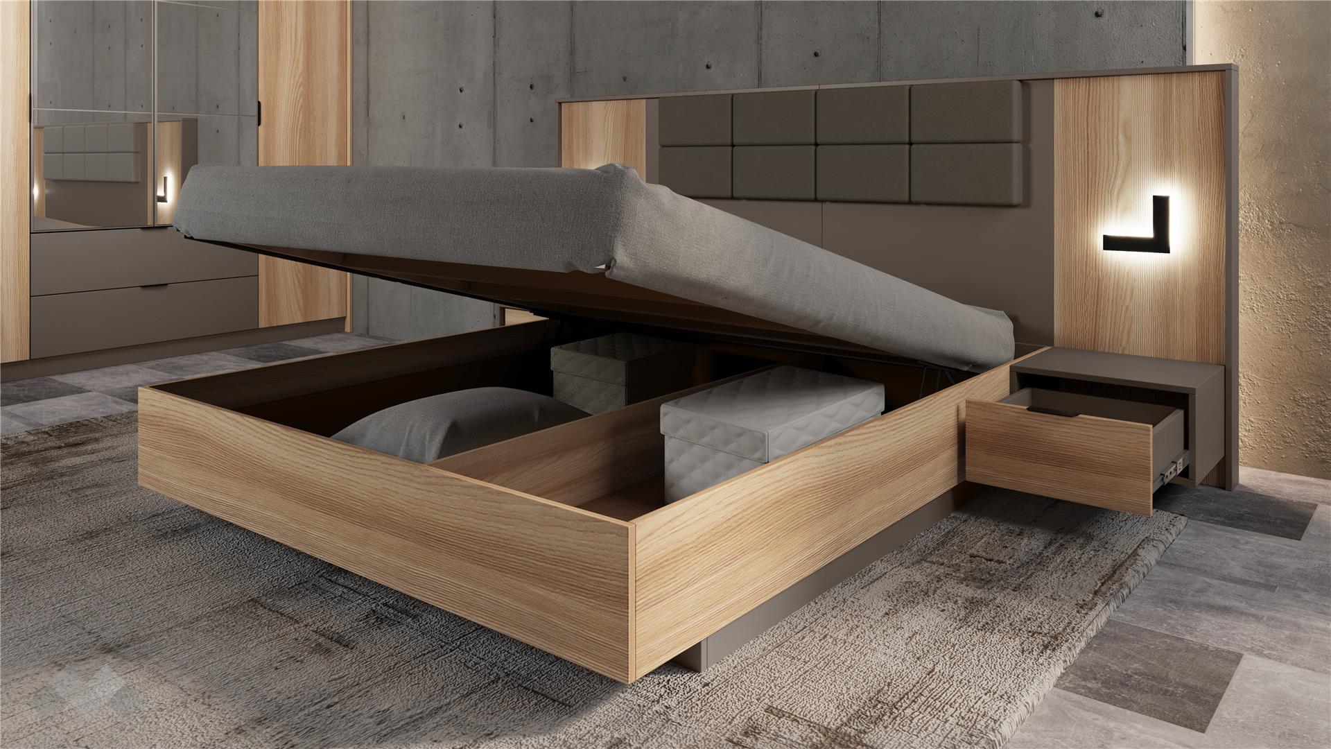 Спалнята се отличава с високи лубове, които с монтиран матрак осигуряват удобна височина за сядане от 51-53 см, и е подходяща за матрак с размери 160/200 см. Тапицираната табла с капучино дамаска, висока 120 см, добавя стилен акцент и предлага комфорт за четене или почивка. Вграденото LED осветление създава уютна и релаксираща атмосфера. Включеният повдигащ механизъм позволява оптимално използване на пространството под матрака за съхранение на багаж и дребни вещи.