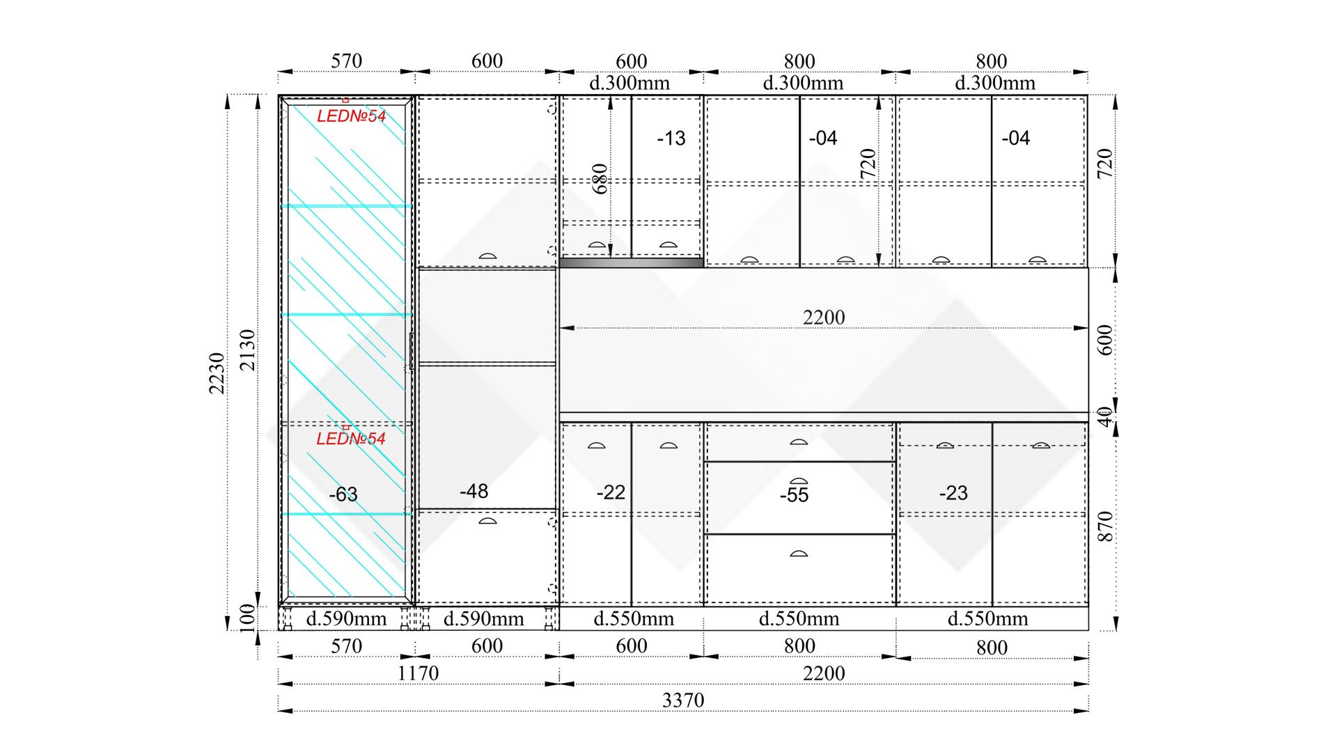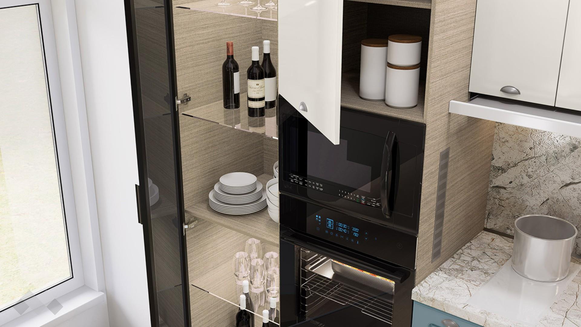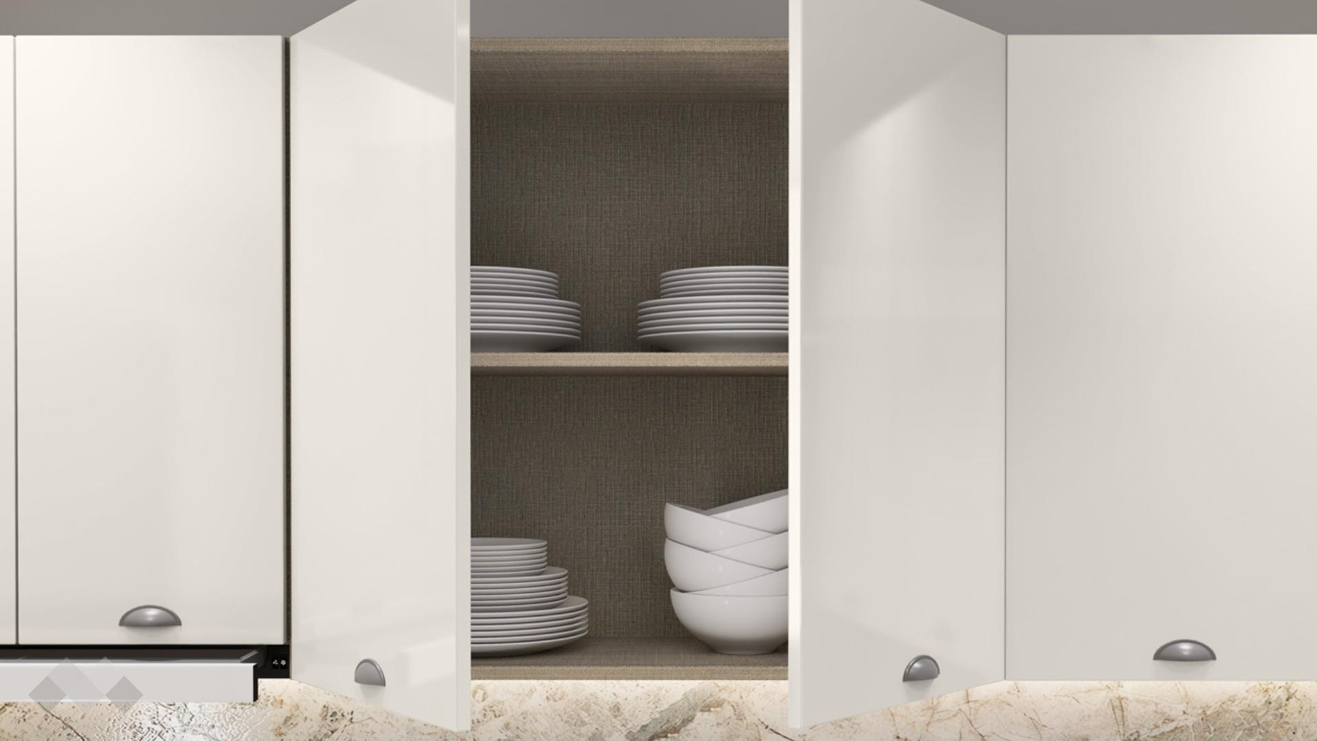 Горния ред шкафове са просторни за най-често използваните уреди и посуда. Шкаф за вграждане на фурна и микровълнова. Долния ред шкафове е функционално подбран - перфектната комбинация на рафтове и чекмеджета, за да поберат често използваните уреди, подправки и посуда. Витринния шкаф е с опушени матови стъкла 4 мм., 4 рафта и LED осветление, за да изглежда още по-елегантно