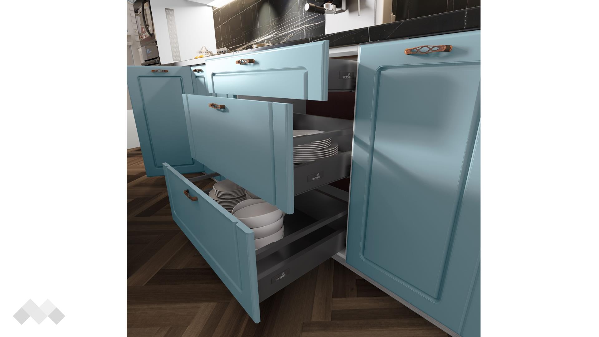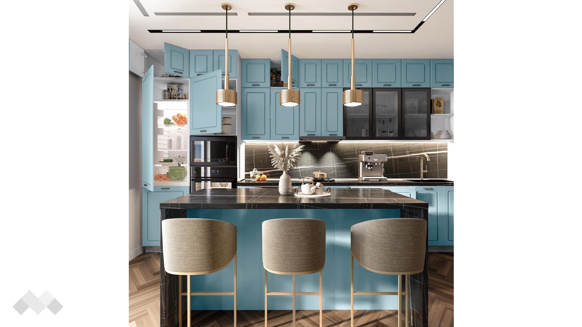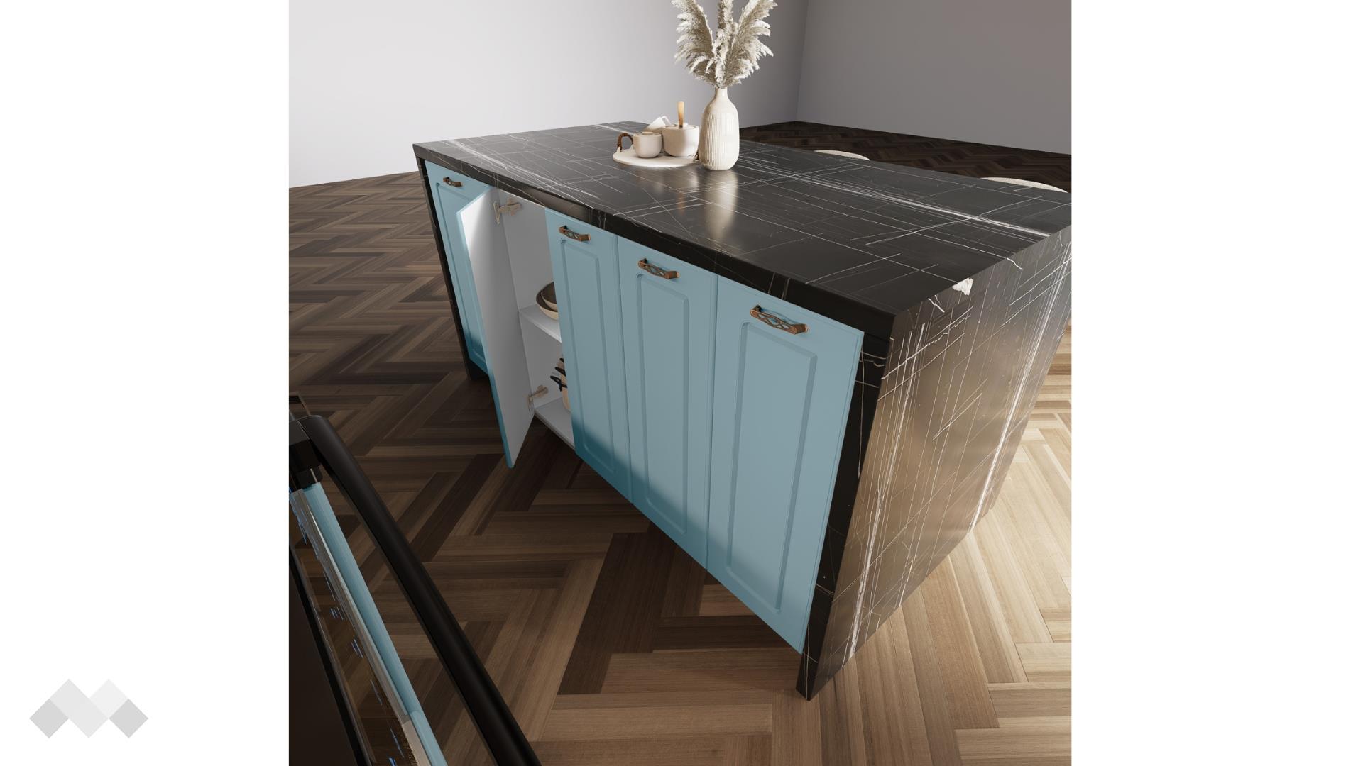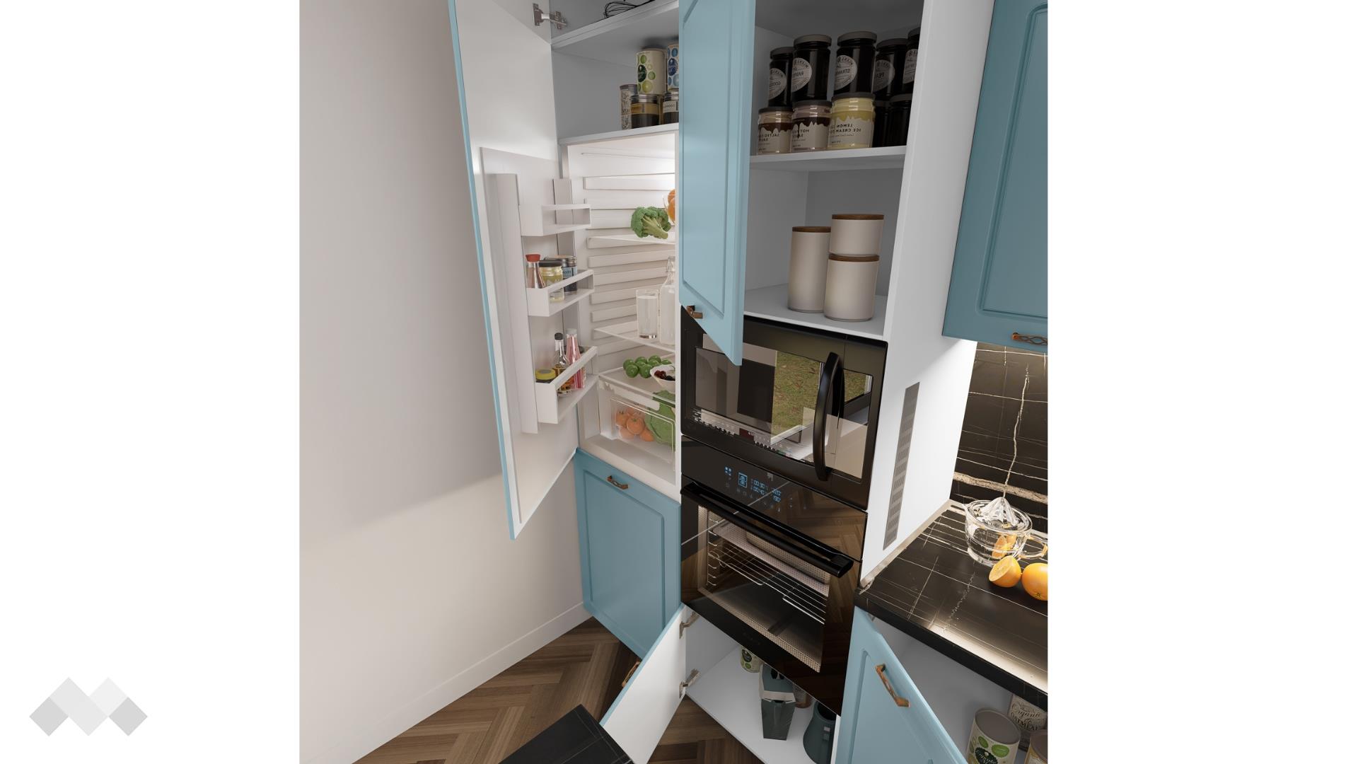 Шкаф стандартен размер за вграждане на хладилник - за да бъде всичко в синхрон. Шкаф за вграждане на фурна и микровълнова. Долния ред шкафове е функционално подбран - перфектната комбинация на рафтове и чекмеджета, за да поберат често използваните уреди, подправки и посуда. Островът - допълнително място за съхранение, още площ за работа и място за сладки приказки и хапване.
