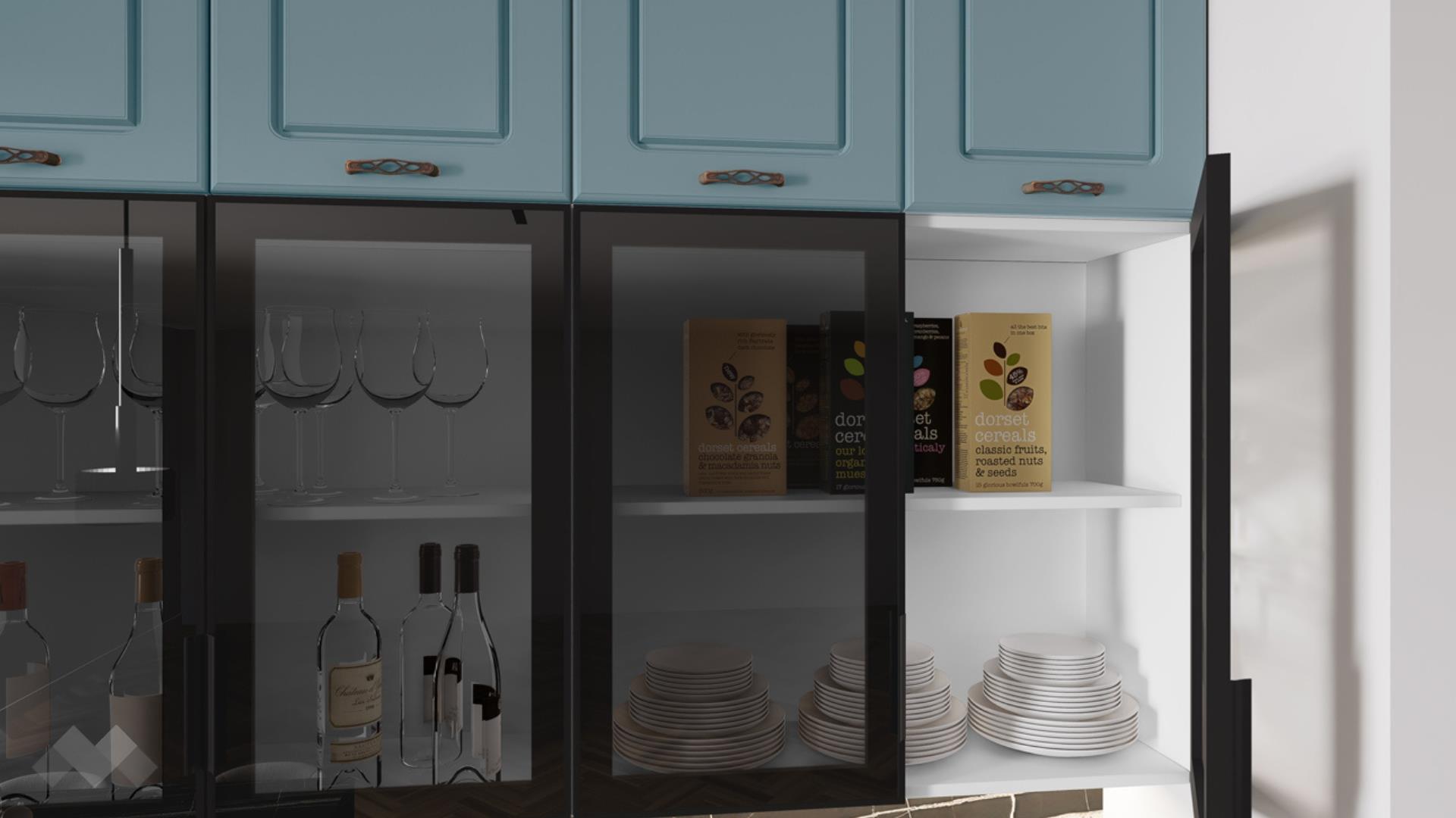 Горния ред шкафове са удобни и функционални - побират малко изполваните уреди и съдове. Основния ред горни шкафове са просторни за най-често използваните уреди и посуда. Витринните шкафове са с опушени матови стъкла 4 мм., за да изглежда още по-елегантно.
