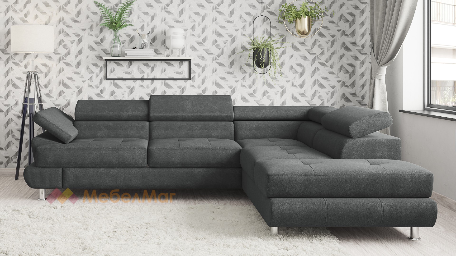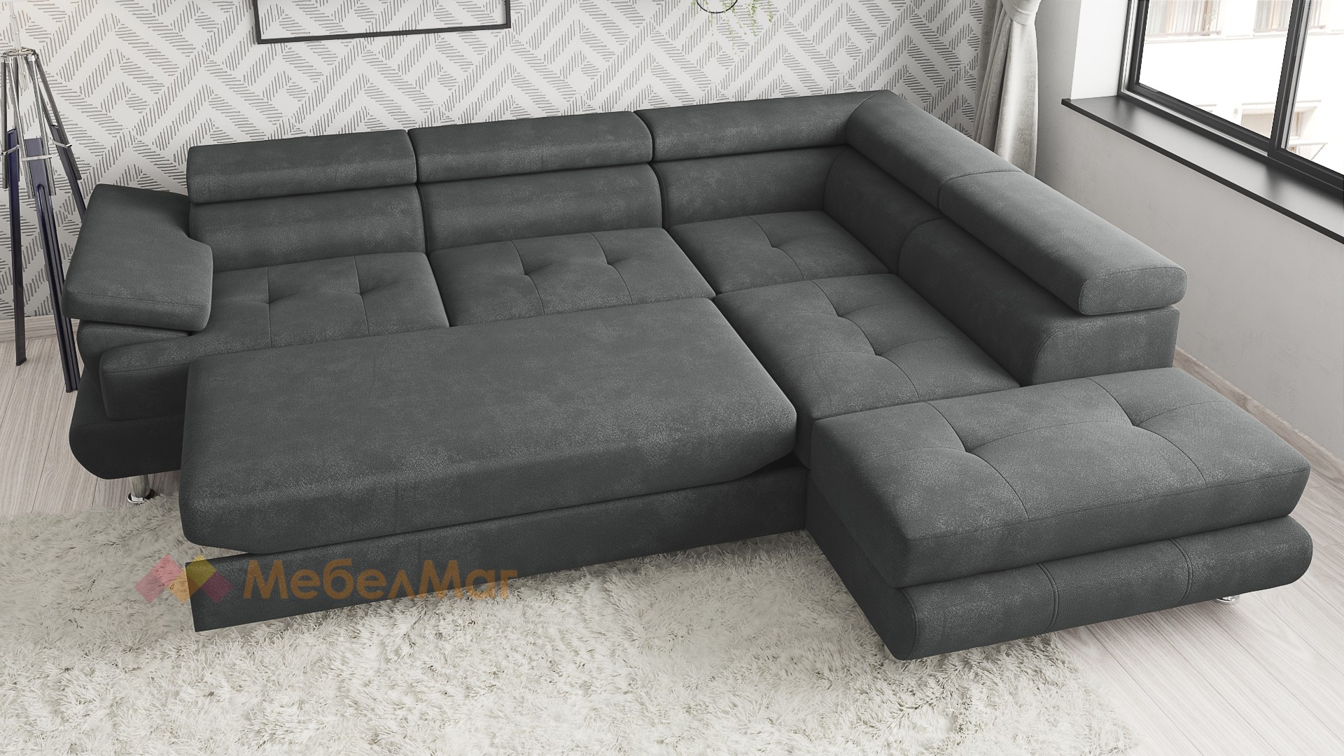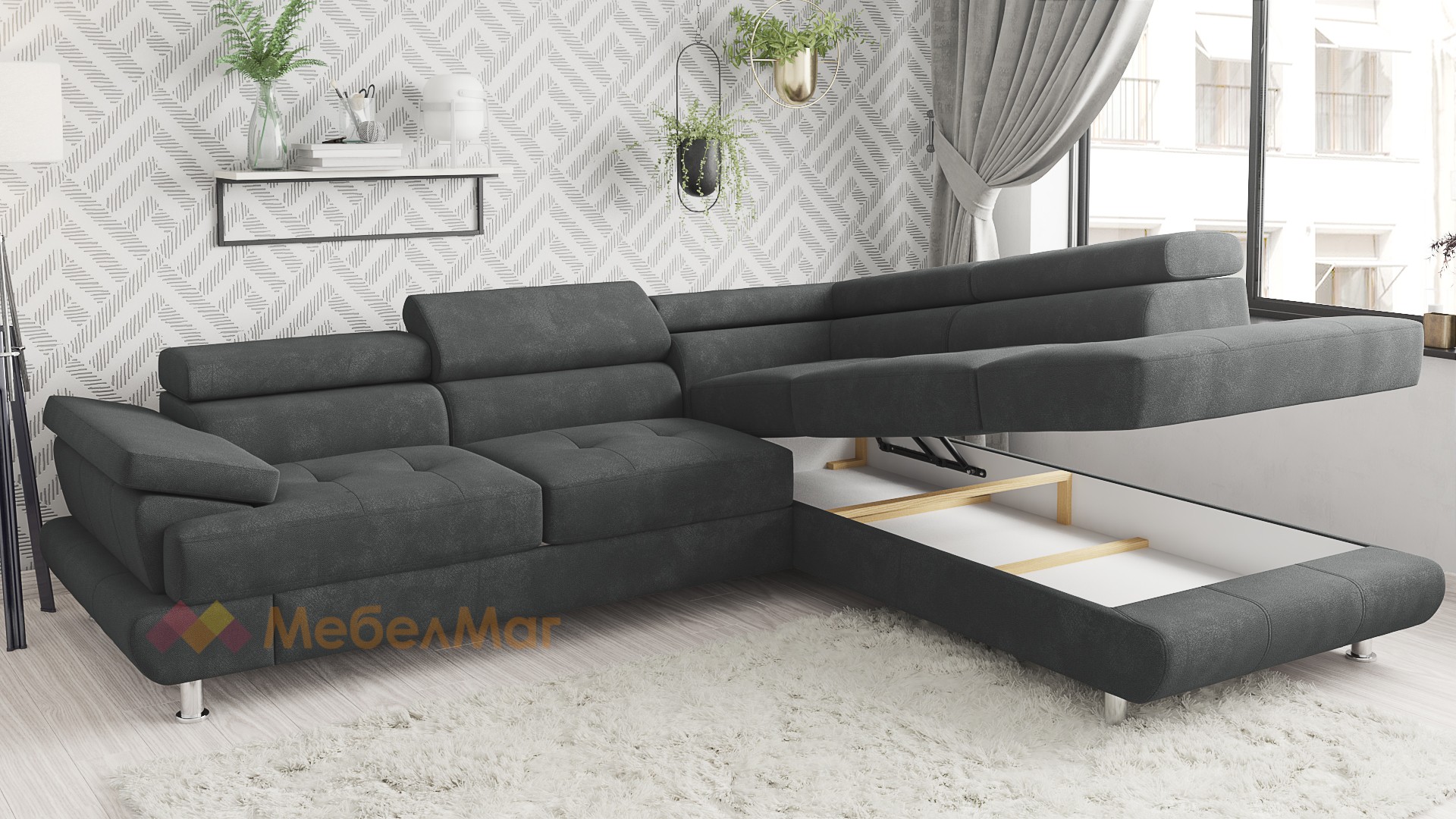 Трите регулируеми подглавника и подлакътника можеш да поставиш в няколко варианта, в зависимост от желанието и индивидуалния ти комфорт. Под лежанката е разположена голяма ракла, в която да съхраняваш завивки, възглавници и всичко за комфортен сън и почивка. Посредством подматрачния механизъм, ъглов диван Падуа разкрива място за сън с размери 190/125 см.