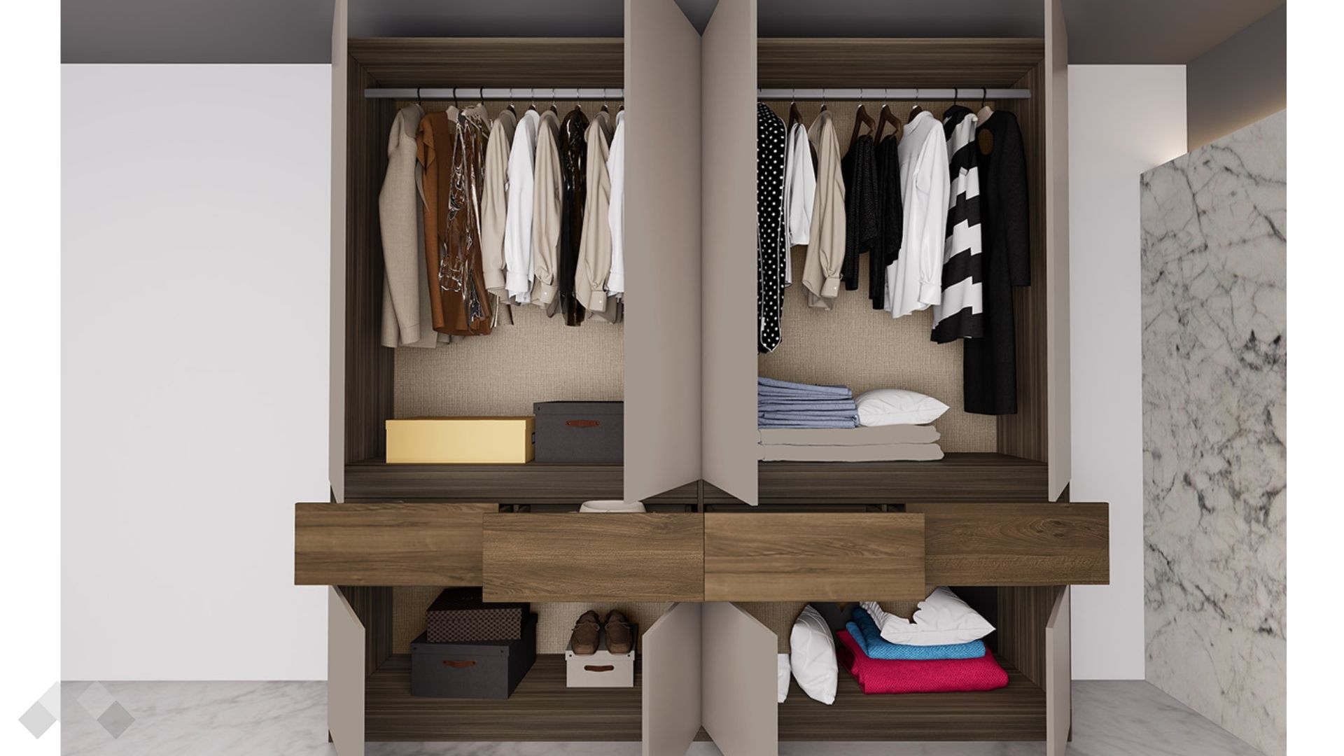 Изчистените матови врати подчертават модерната визия на гардероба. Вътрешното разпределение е добре организирано, осигурявайки достатъчно място за подредба на дрехи и аксесоари. Разполага с четири чекмеджета за дрехите, които държиш да са сгънати, два лоста за закачалки, за тези които не искаш да гладиш и два шкафа за кутийте с обувки или спално бельо.